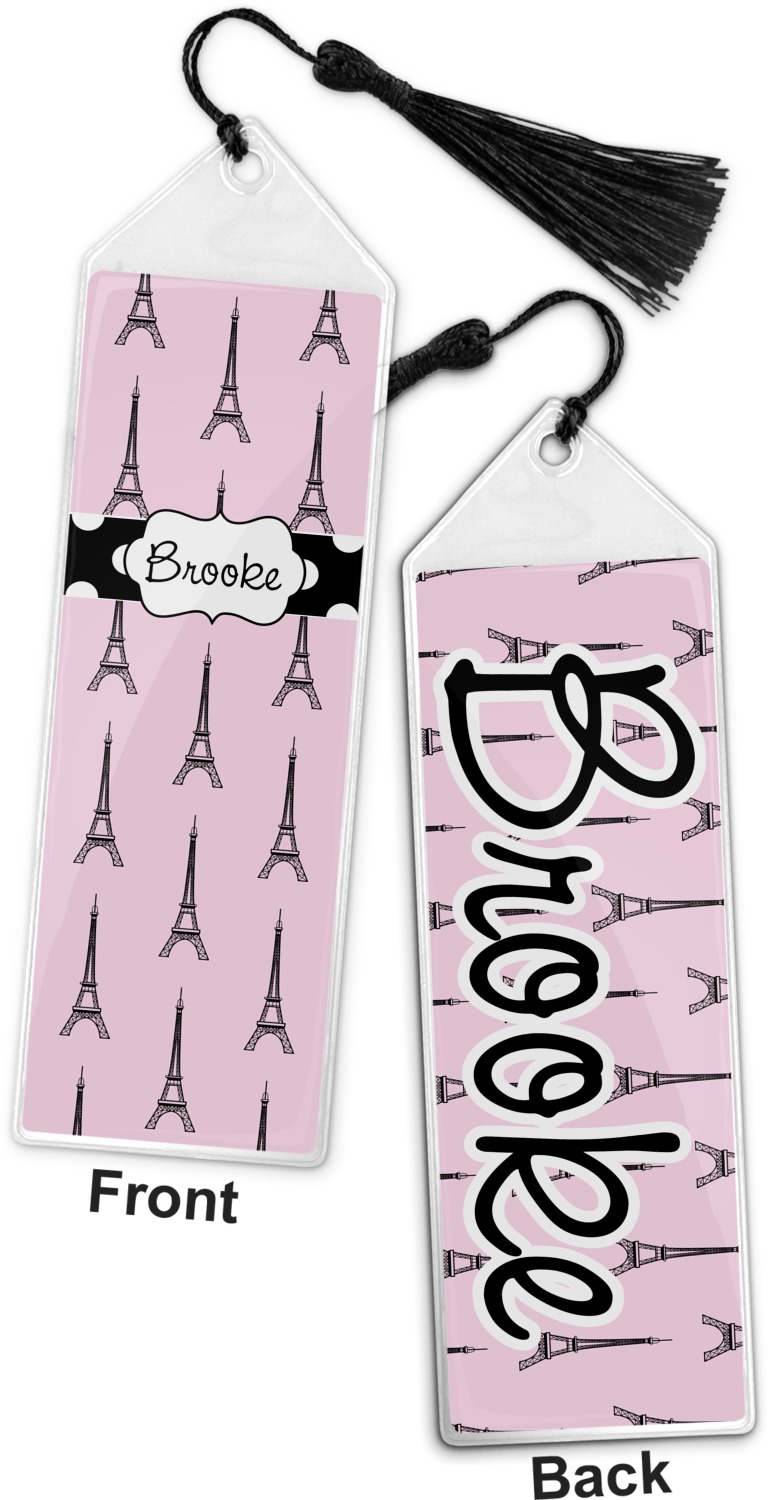 Your personalized bookmark is made of a sturdy, clear vinyl, and is approximately 7.5" x 2.25". We display your personalization on vinyl inserts that are placed on both sides. Accompanying each book marker is a black, fringe tassel that attaches to the reinforced, triangular header.