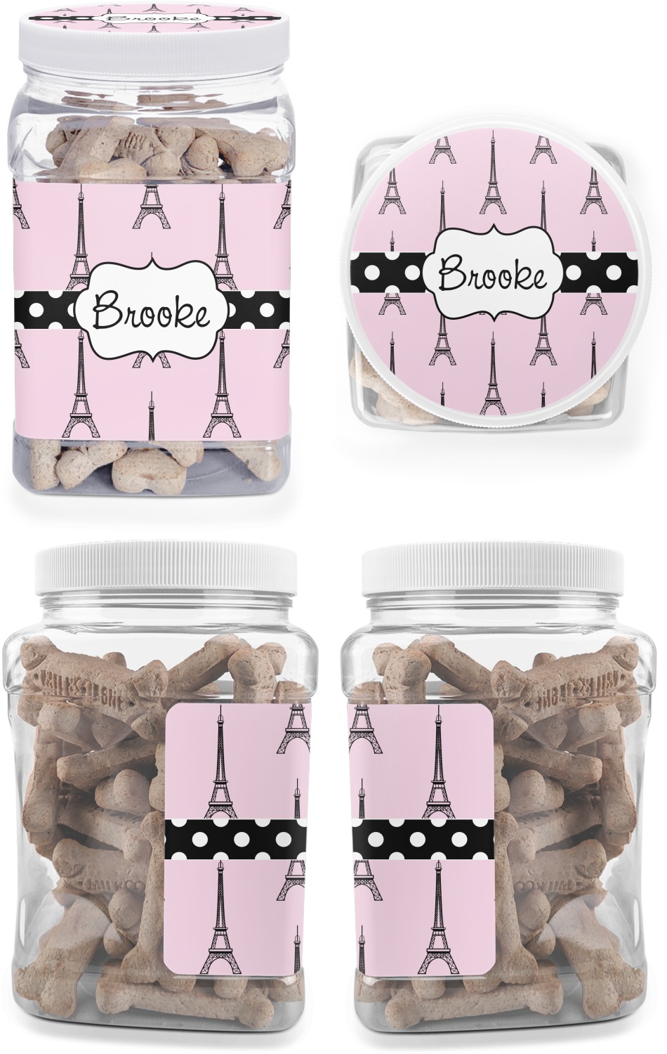 This half gallon jar, made from a sturdy plastic, is the perfect way to keep treats from any naughty pet paws, while still keeping them ready on hand for when your pup performs an impressive trick. This dog cookie jar features a screw-on, white lid that displays your personalized design on a vinyl sticker. We apply another customized sticker that wraps around the front and sides of the jar. Our dog treat jar also has indentations on the rear ends of the sides, which allows for convenient handling, and its square frame allows for easy storage.