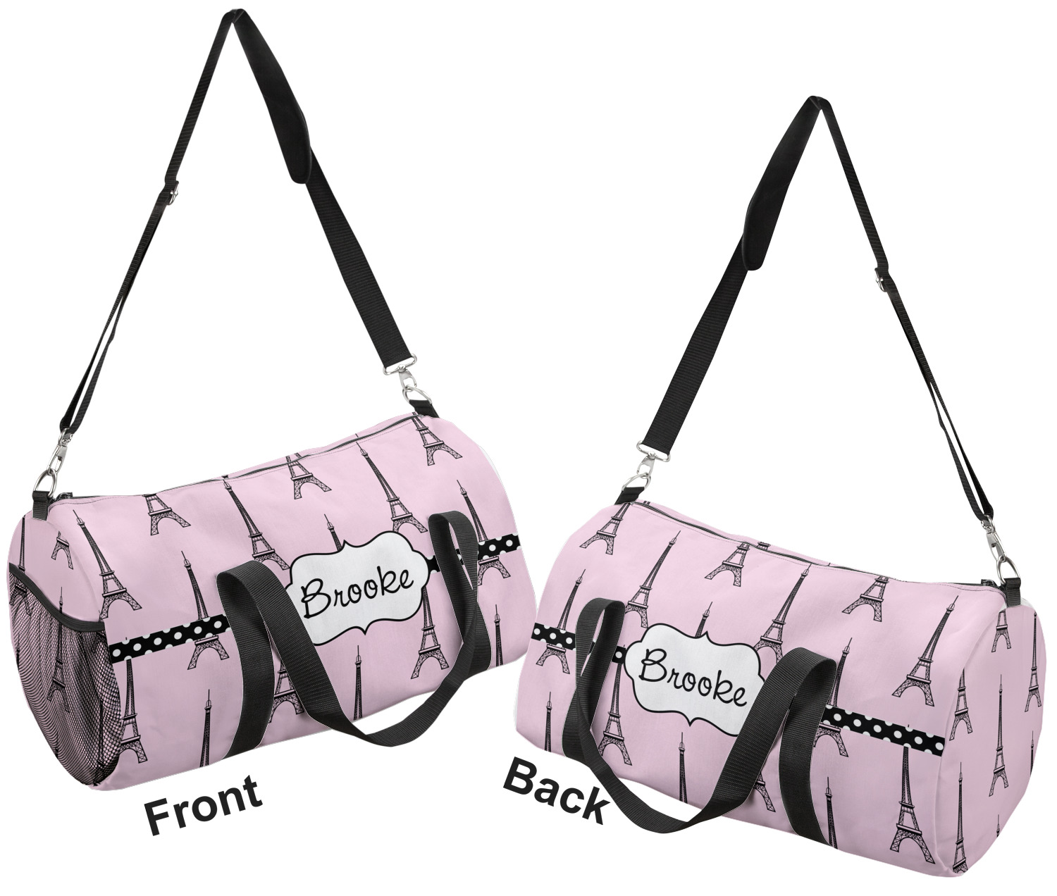 This duffle is a sturdy bag made of a canvas material. It comes in two sizes: Small (19"W x 9.5"H x 9.5"D) and Large (23"W x 12"H x 12"D). The bag is a cylindrical shape with a black adjustable strap and two handles. On one side is an elastic pouch to put a waterbottle or other small item. Your product will be sublimated with your design and is able to be designed on the front, back, and sides. Be sure to remember that the straps may cut into parts of your design if you upload your own artwork.