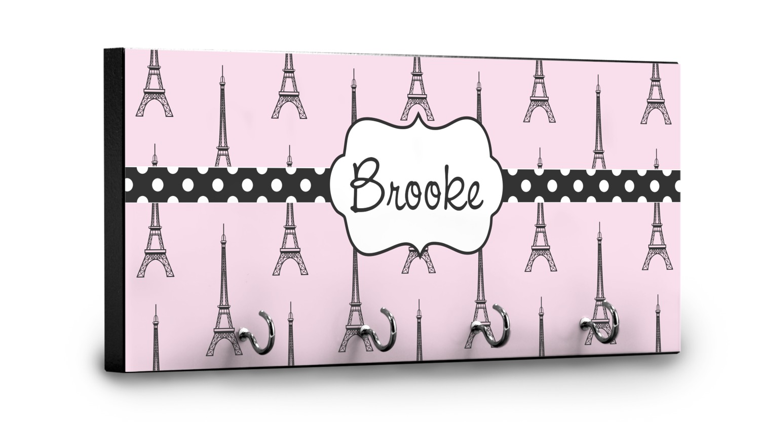 This 11" x 5" key hanger is made of sturdy wood and has four metal hooks lining the bottom. This is the perfect size for a family with several drivers. Not only can you hang keys on it though, but pet leashes and other small items. The board is black on the sides and back and is printed with the design of your choice on the front.