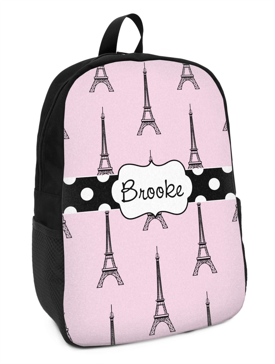 These small backpacks are made of a durable black canvas material with your personalization right on the front. The two shoulder straps are padded and easily adjustable. The bag itself measures at about 11" W x 15" H x 5" D. It's the perfect size for elementary aged kids or adults who want a smaller backpack. On the top of the bag you will find a handle to hang or carry your backpack by as well as a large zipper closure to keep all of your belongings safe inside. On each side of your backpack is a mesh pocket for a small item or water bottle. Inside your backpack you will find a spacious area with a small zipper pocket and a padded laptop slot that will fit up to a 13" laptop (13" being very snug). This is the perfect bag for any student that needs a couple books and their laptop with them at all times. It also works great as a carry on for traveling!