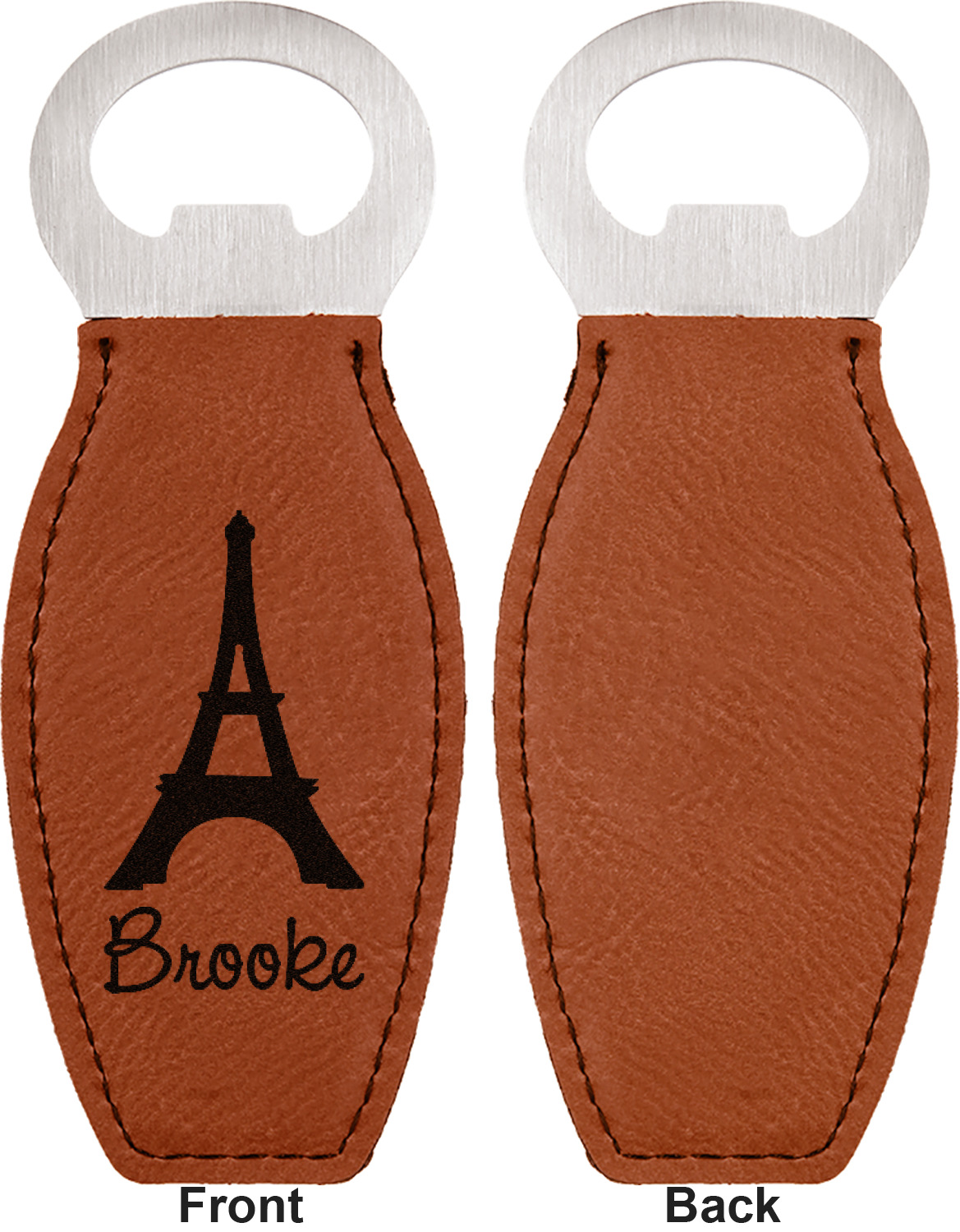 Built from stainless steel, these custom bottle openers are wrapped in a cognac-colored leatherette. Sharp, black stitching lines the edges for extra durability and a finished touch. Your personalization is laser-engraved onto the surface of this leatherette, leaving behind a crisp, black coloration. At 4.6 by 1.8 inches, this beer bottle opener gives you much of leverage when trying to open a stubborn bottle. On the opposite end of the opener, you'll find a magnet that you can use to display your new, unique bottle opener!