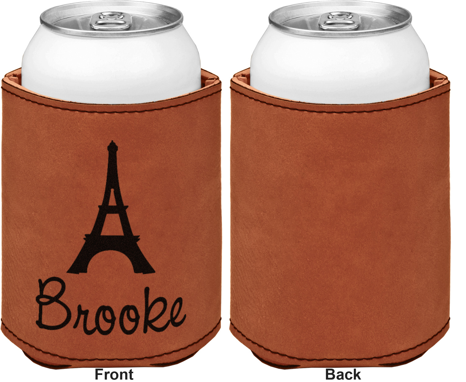 This can sleeve is made from a cognac-brown leatherette and stitched with a sturdy, black thread. A slim padding lines the inside of your can sleeve to allow for a better fit once your drink is inserted. The sleeve itself measures at 4 by 4.5 inches, allowing this custom can sleeve to accommodate most canned drinks. Your personalized design can be engraved on the front and back, or solely the front. When laser-engraved, your design appears as a black coloration which contrasts the leatherette nicely.