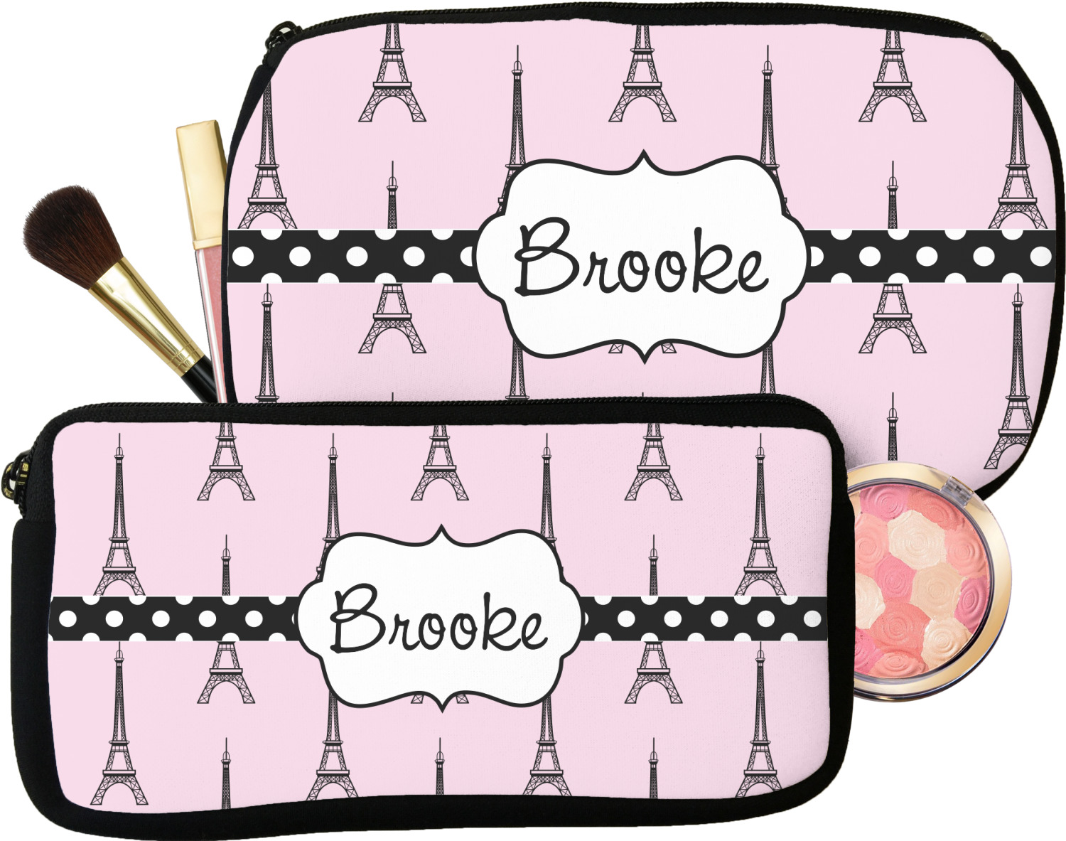 Our personalized makeup bags are available in many different designs, patterns and colors - so you are sure to find one that will love. They are made of neoprene (same material as wet-suits) and thus are water resistant, so spillages in your makeup bag will not end up all over you purse. They are customized on one side and are black on the other side and the zipper is black as well.