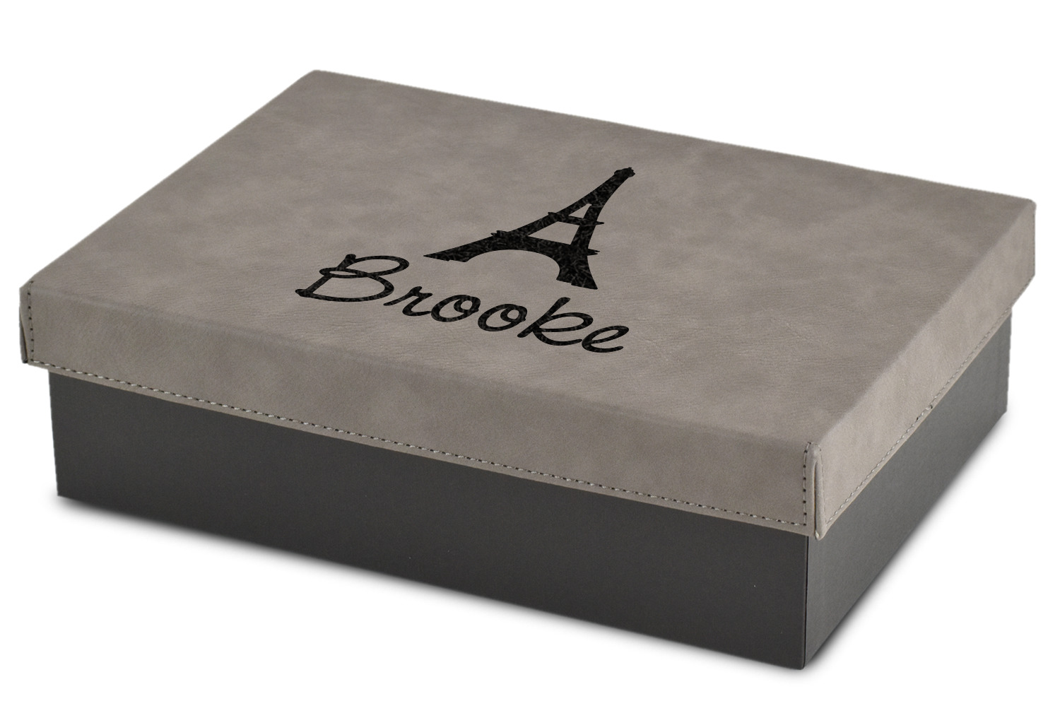 These gift boxes are available in 3 different sizes to accommodate various sized gifts. Available in gray as a neutral color for any occasion as well as to showcase your design boldly. Engraved with a laser this high quality paper board and faux leather gift box is unique and makes any gift stand out.