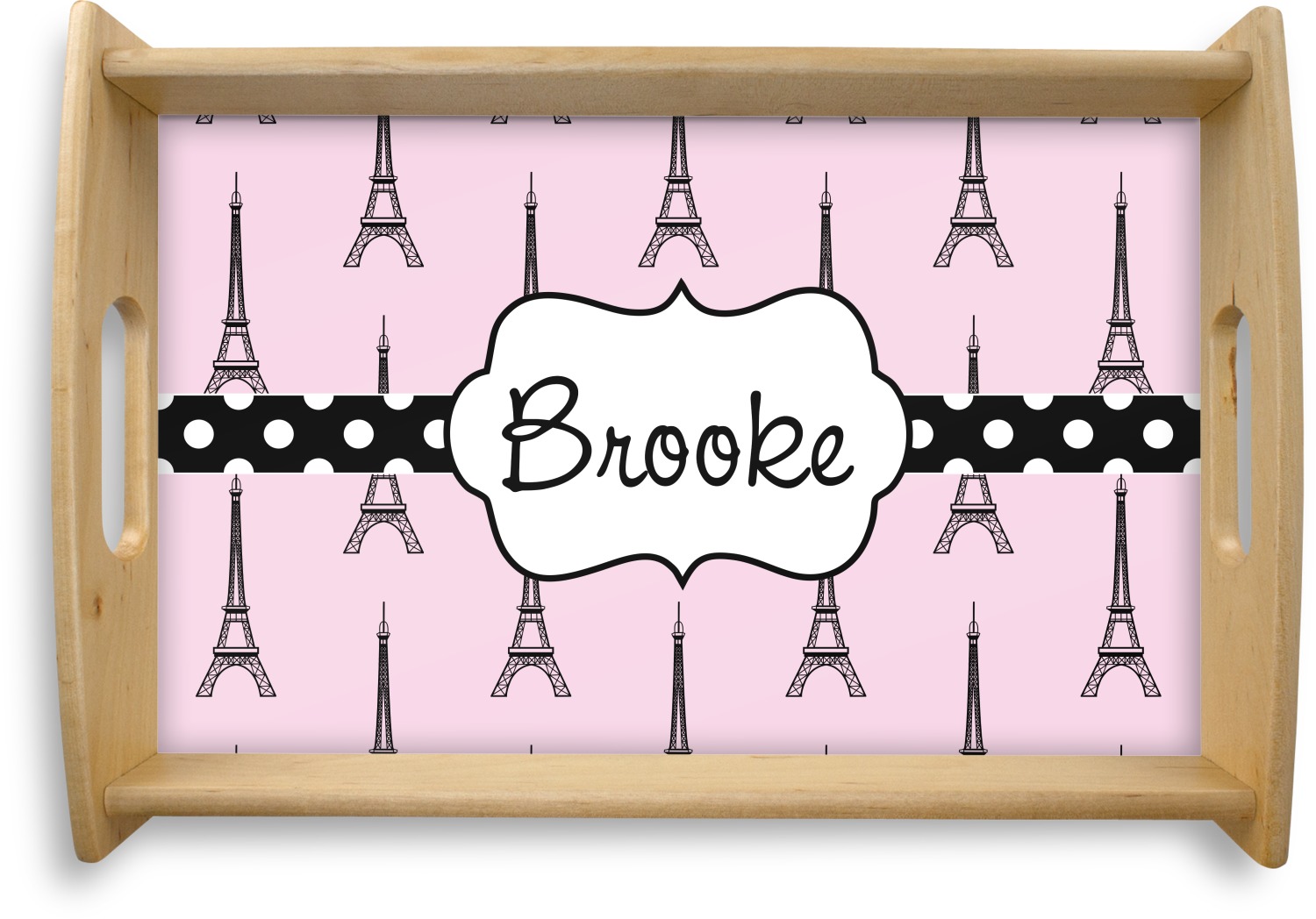 This serving tray with handles features square edges and two rounded sides, creating a very modern look. Each side is fabricated from a beautifully cut, natural wood. The bottom of the interior of the tray displays your customized design in bright, vibrant color. The tray is sold in both a black color and a natural wood look. Each variation of the wood serving tray has two sizes: Small, which is 14" x 10" x 2.25", and Large, which is 19.5" x 13.5" x 2.75".