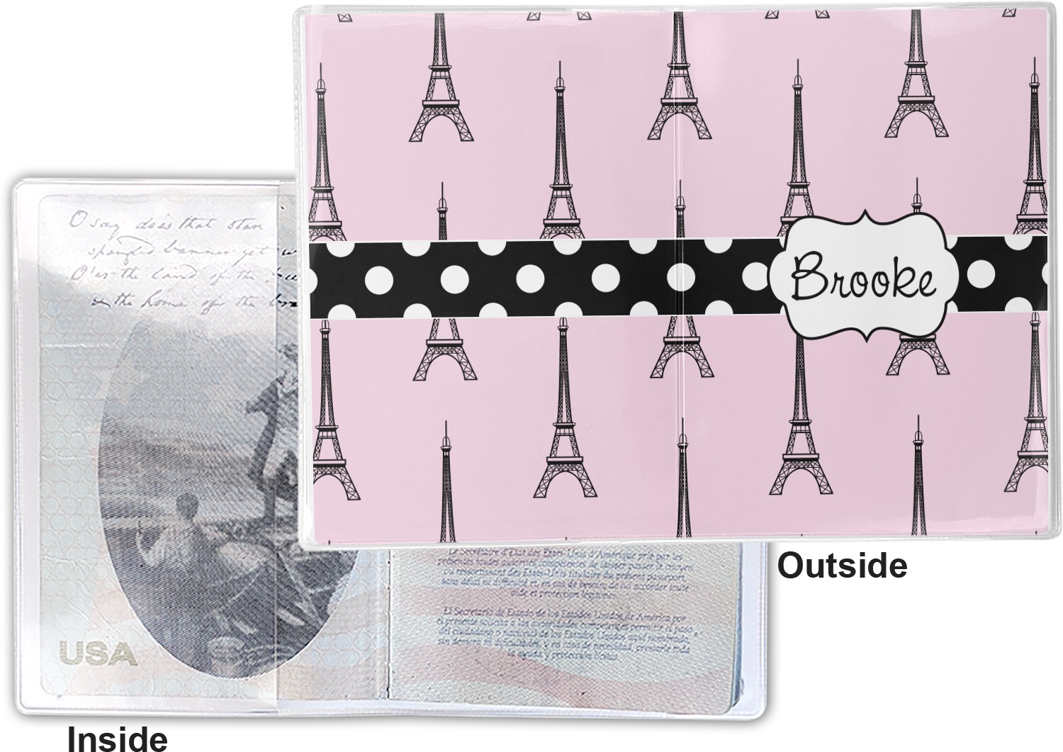 This cover is made of a sturdy clear vinyl with a personalized vinyl insert inside. There is a large and a small pocket on either side to hold the covers of your passport easily and firmly. The passport holder is approximately 7.5" x 5.25", the perfect size to snugly fit your passport. This slim cover is the perfect way to protect your passport without being one more bulky item you have to carry.