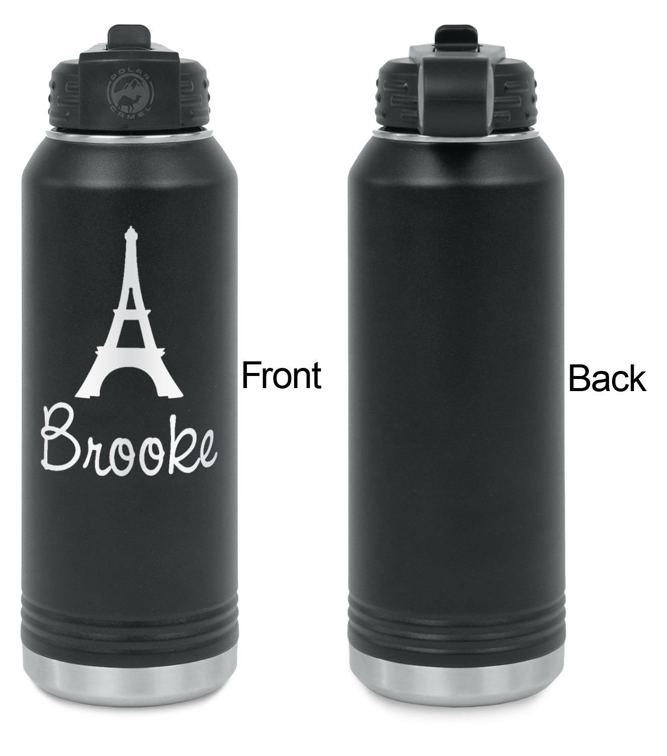 Your design is laser engraved on the water bottles. The engraving removes the black powder coating in the designed area to expose the silver stainless steel underneath.