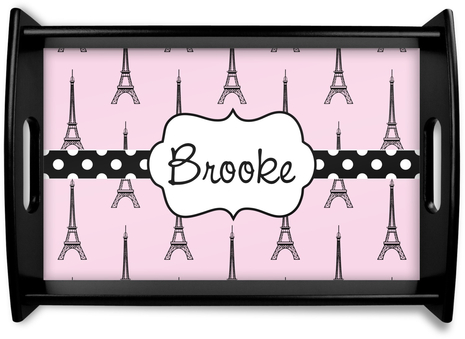This serving tray with handles features square edges and two rounded sides, creating a very modern look. Each side is fabricated from a beautifully cut, natural wood. The bottom of the interior of the tray displays your customized design in bright, vibrant color. The tray is sold in both a black color and a natural wood look. Each variation of the wood serving tray has two sizes: Small, which is 14" x 10" x 2.25", and Large, which is 19.5" x 13.5" x 2.75".