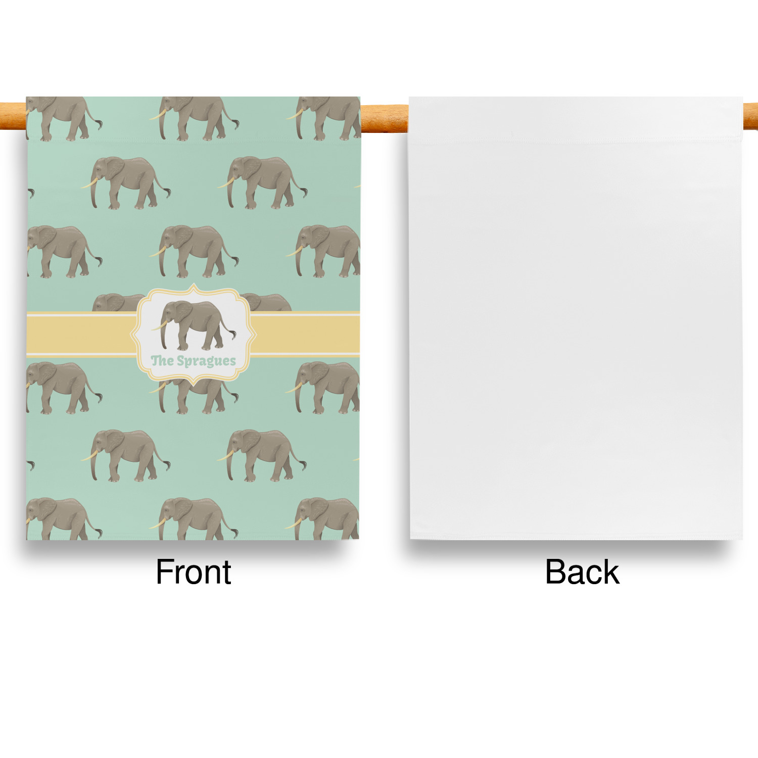 An elephant never forgets, and we hope you won't forget this Elephant design. The design shows gray, tusked elephants on a mint background with a light yellow ribbons. The center has a label with an elephant and a space for text.