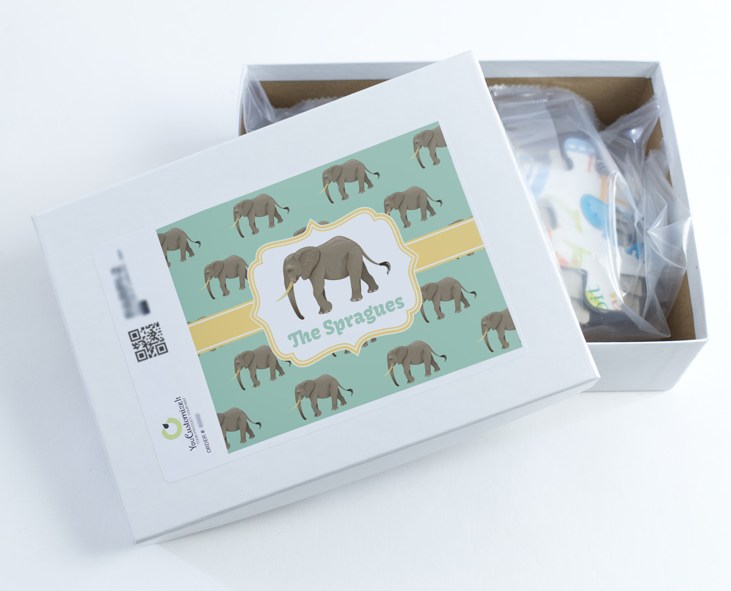 An elephant never forgets, and we hope you won't forget this Elephant design. The design shows gray, tusked elephants on a mint background with a light yellow ribbons. The center has a label with an elephant and a space for text.