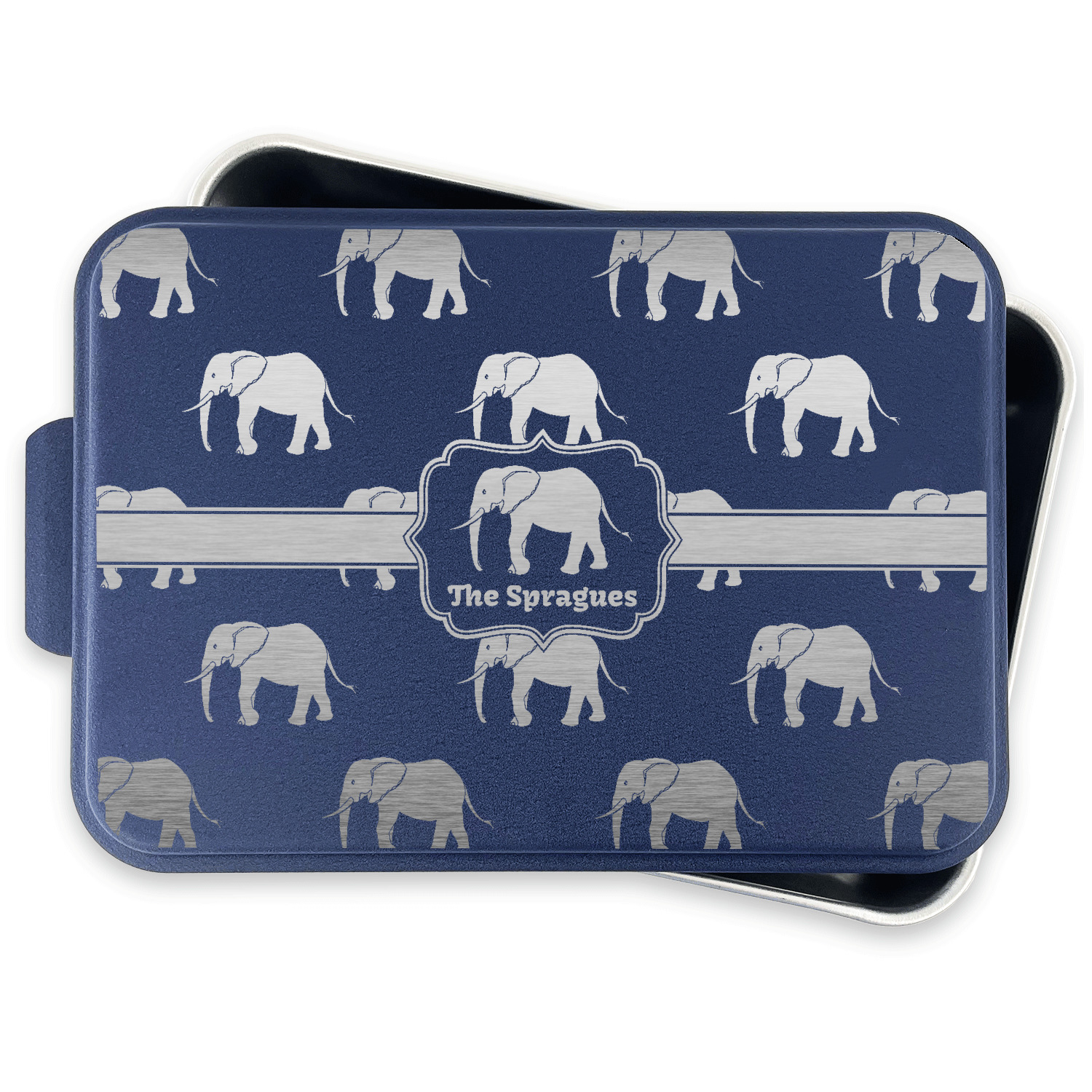 An elephant never forgets, and we hope you won't forget this Elephant design. The design shows gray, tusked elephants on a mint background with a light yellow ribbons. The center has a label with an elephant and a space for text.