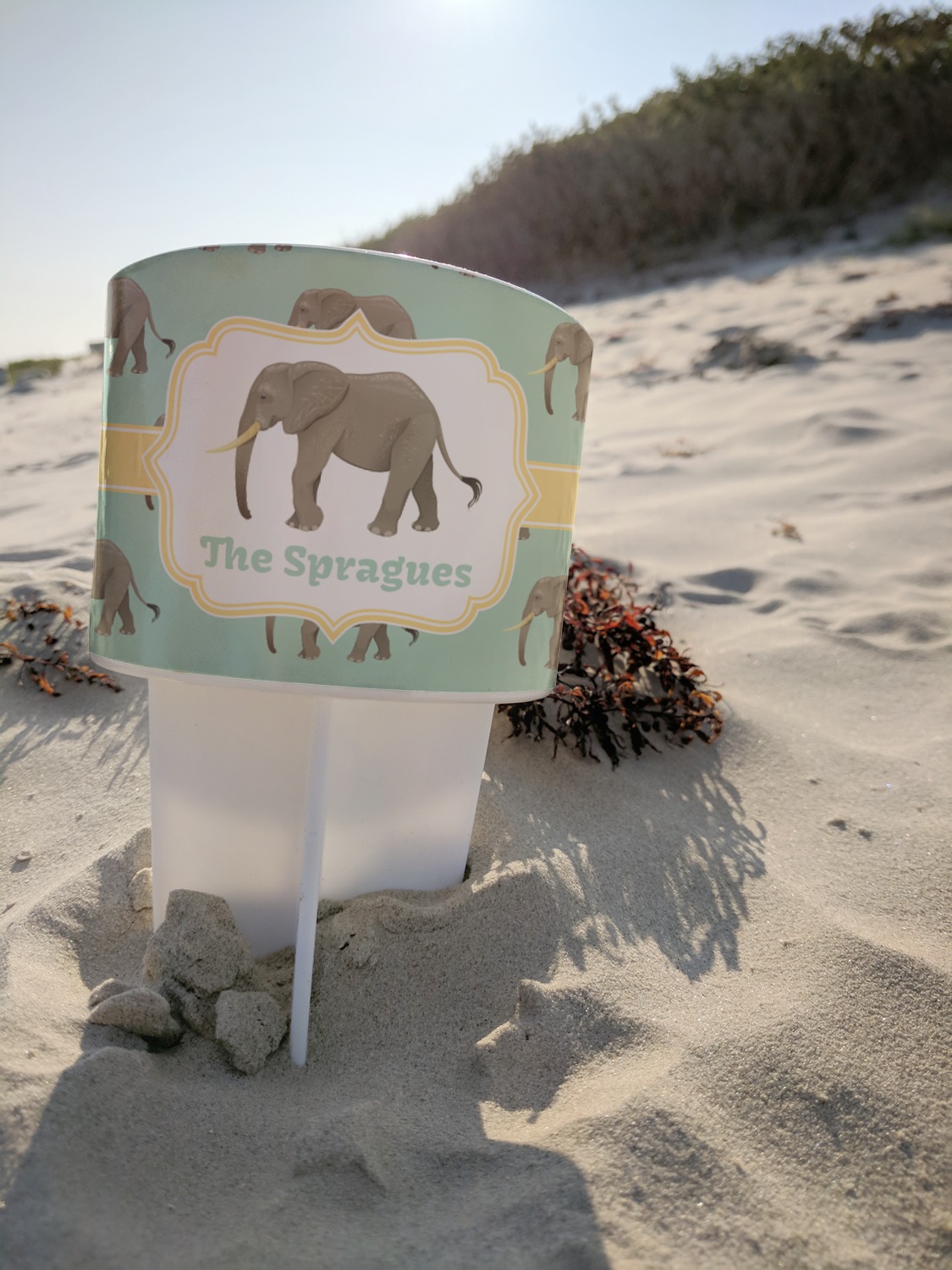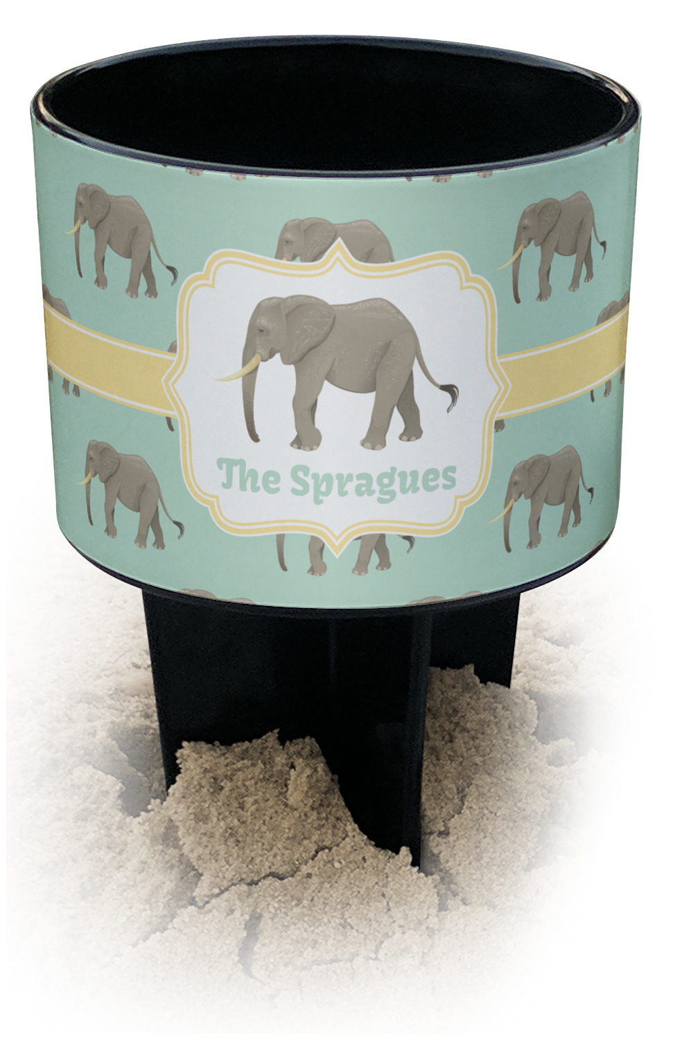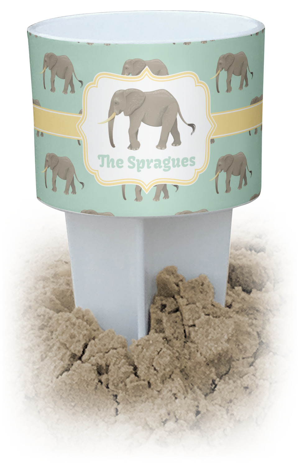 This cup holder has a large stake at its bottom that anchors it to the sand or ground below, while the cup holder rests above the stake. The entire drink holder is made of durable plastic and displays your customization around the cup holder portion. We sell these personalized beach spikers in two different colors: black and white.