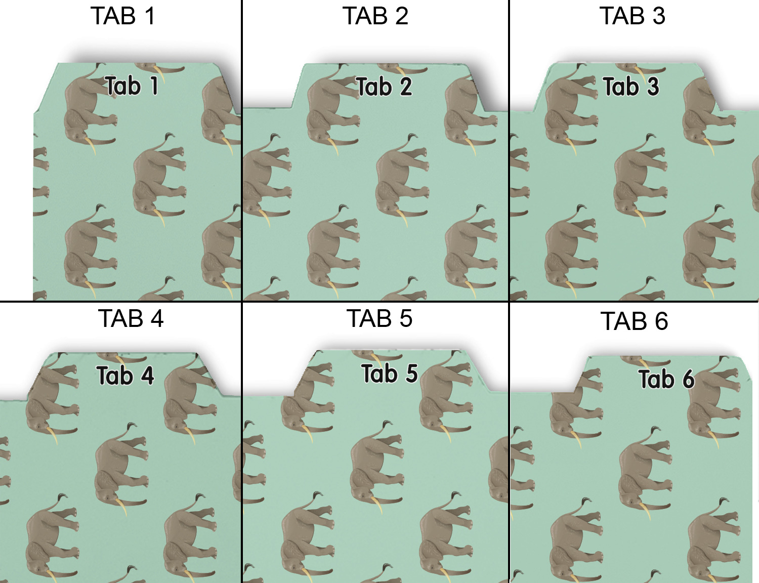 Whether you use binders at school or at work, we have designs to suit all of them. Available in 5 or 6 tab sets, you are sure to find a set to suit your needs. The back of each one is white and can be used to take notes, write vital information on, etc.