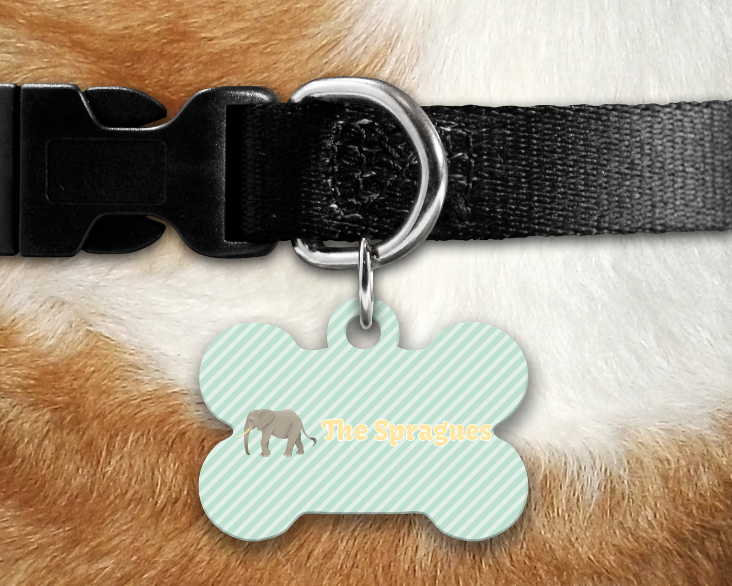 Our default design templates print your dog's personalization on the front and your contact information on the back; however everything is customizable, so you customize the patterns, the colors, the personalization, the contact information etc.
