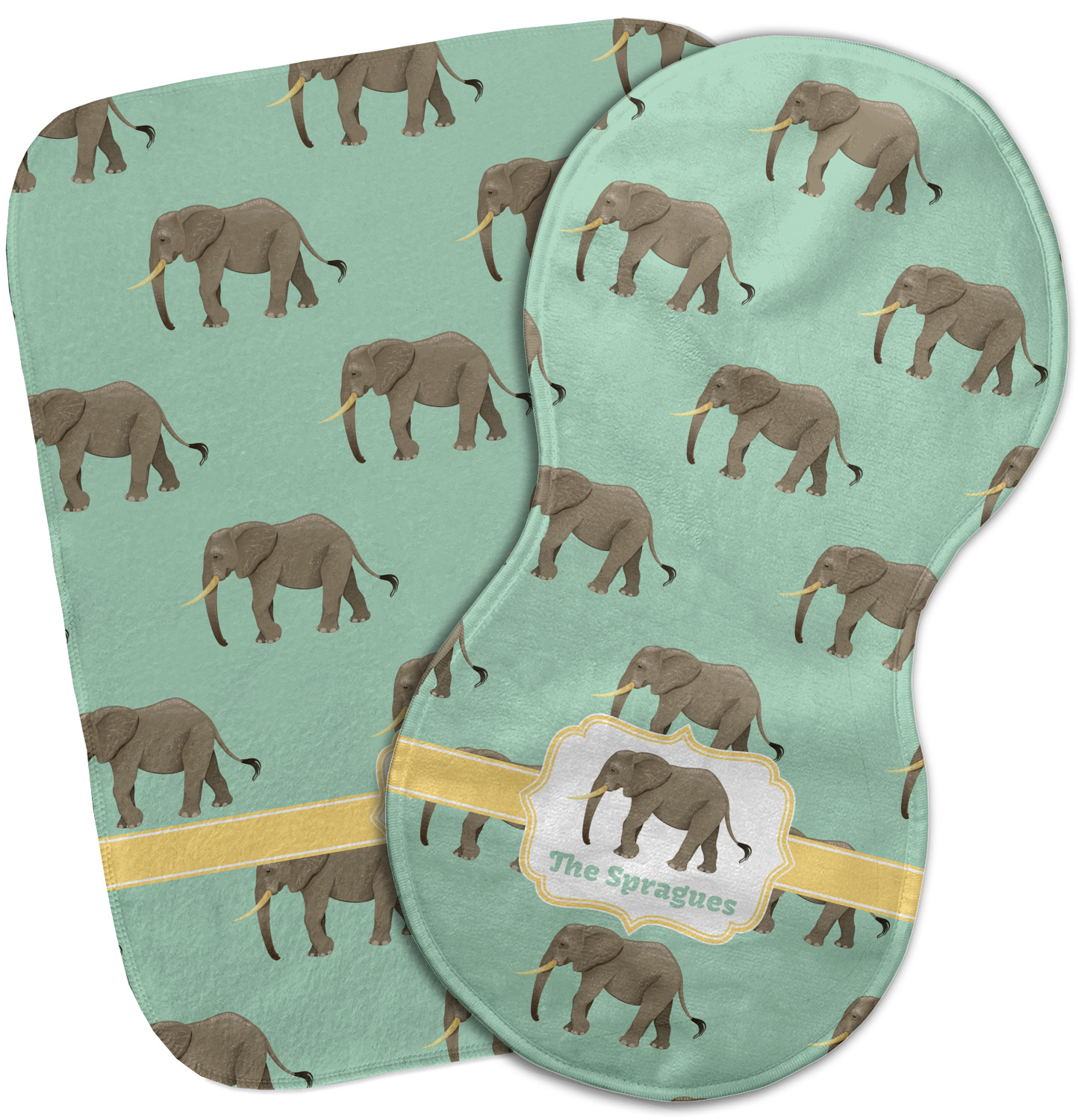 An elephant never forgets, and we hope you won't forget this Elephant design. The design shows gray, tusked elephants on a mint background with a light yellow ribbons. The center has a label with an elephant and a space for text.