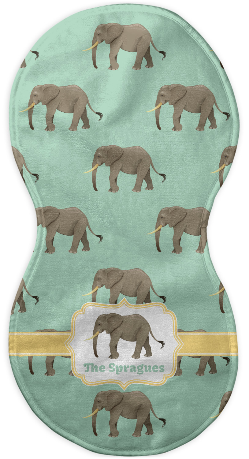 An elephant never forgets, and we hope you won't forget this Elephant design. The design shows gray, tusked elephants on a mint background with a light yellow ribbons. The center has a label with an elephant and a space for text.