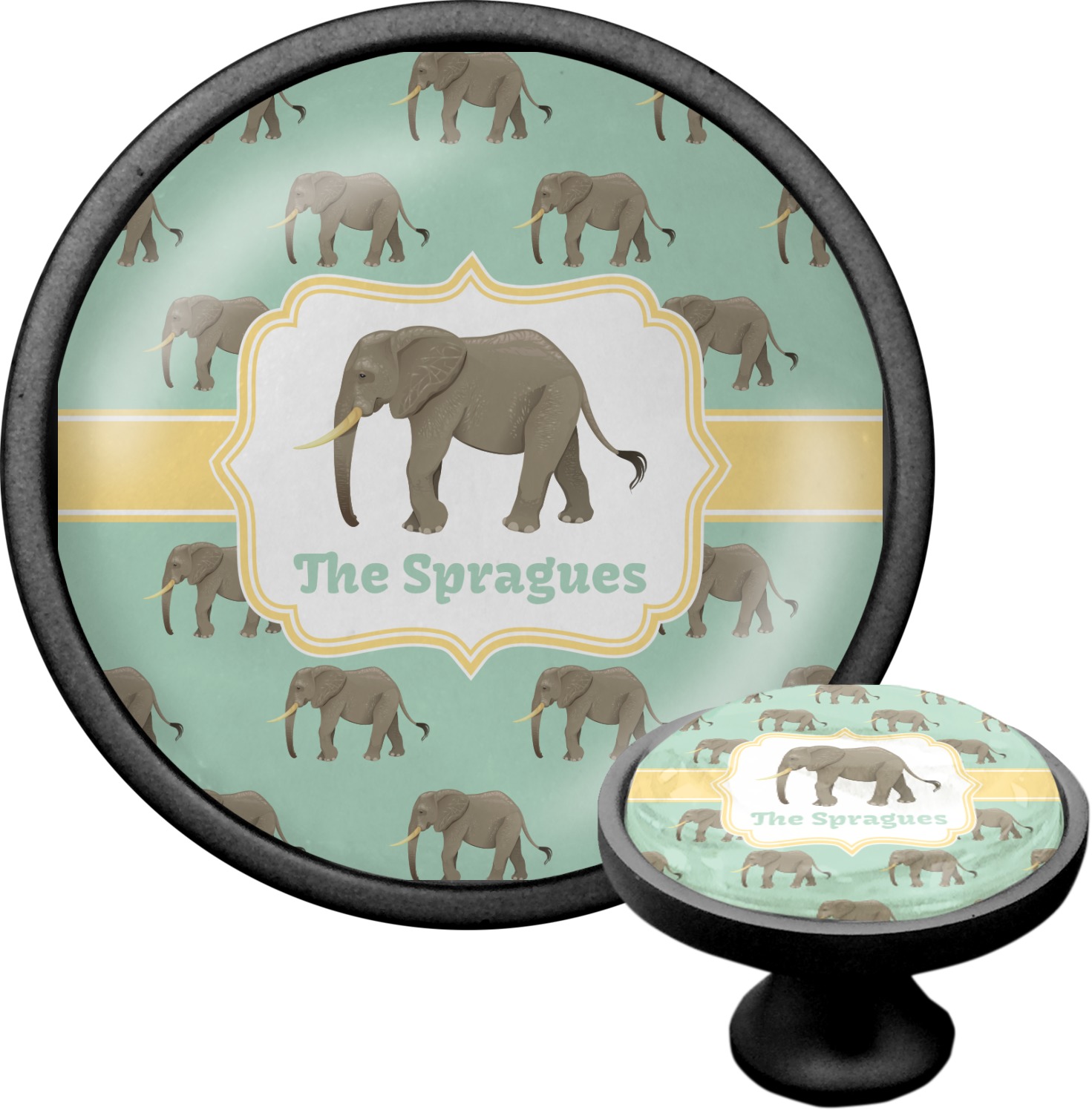 An elephant never forgets, and we hope you won't forget this Elephant design. The design shows gray, tusked elephants on a mint background with a light yellow ribbons. The center has a label with an elephant and a space for text.