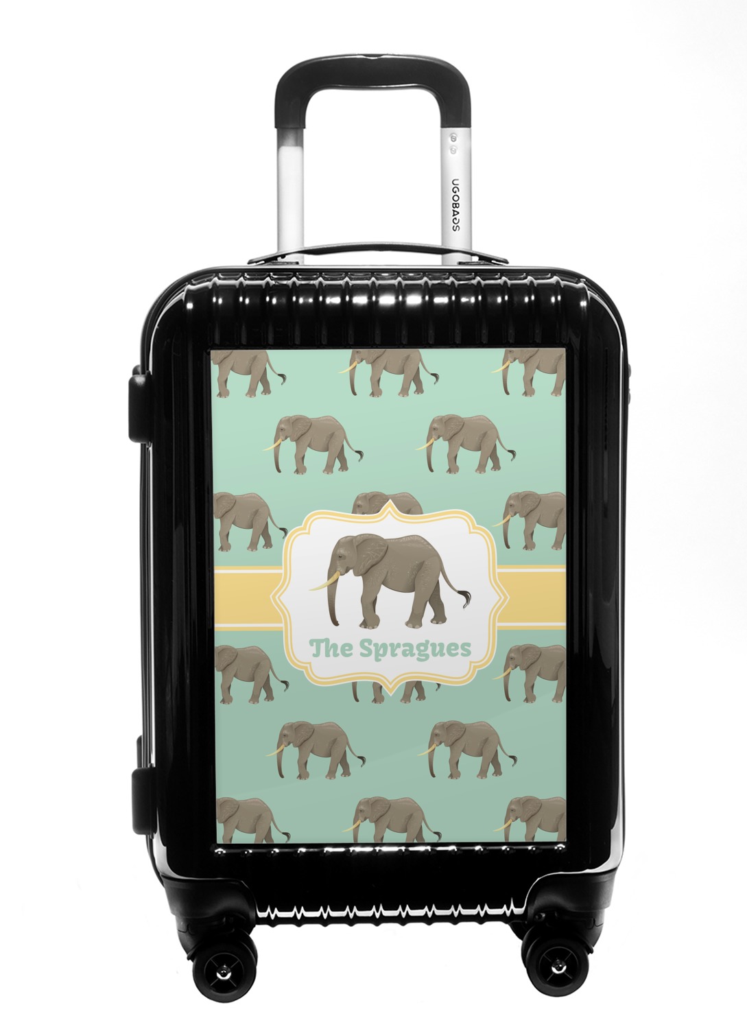 An elephant never forgets, and we hope you won't forget this Elephant design. The design shows gray, tusked elephants on a mint background with a light yellow ribbons. The center has a label with an elephant and a space for text.