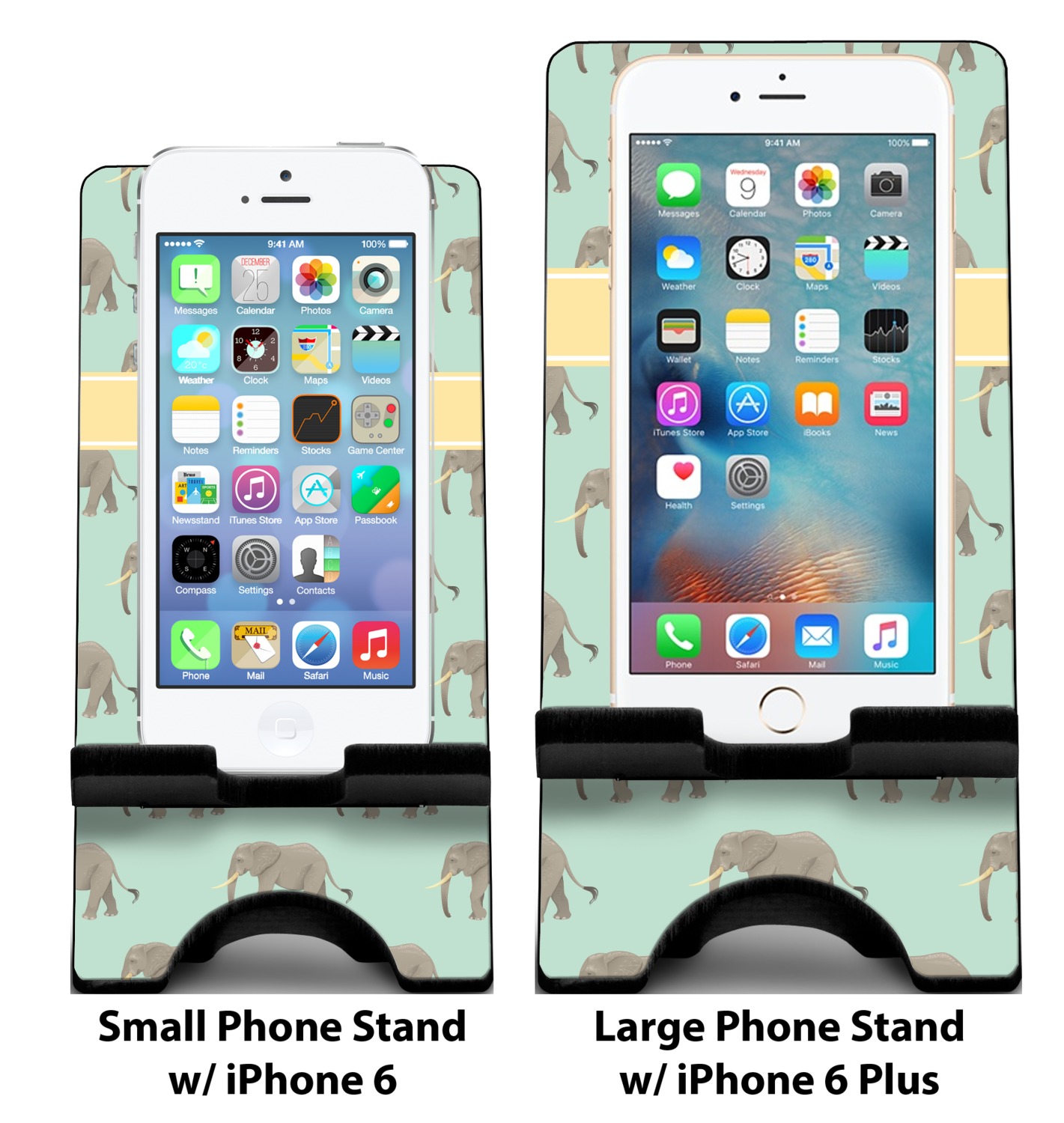 To meet your needs, we offer four variations of this IPhone stand. The backboard of the first version is shaped as a plain, yet sleek rectangle, and is available in two sizes. Our smaller size is approximately 4 by 3.25 by 7 inches, while the larger model is 4 by 3.77 by 8.5 inches. Alongside this model, we also provide you with a more decorative option. The upper part of our second version features a curved edge, for a classy, suave appearance. This phone holder is also sold in two sizes: a smaller version, which is 4 by 3.25 by 7 inches, and our larger model, which is 4 by 3.77 by 8.5 inches. Both models will support large phones, but the larger model is better if you wish to proudly display your personalized design.