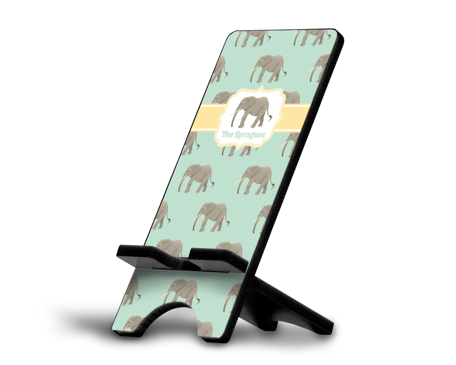 An elephant never forgets, and we hope you won't forget this Elephant design. The design shows gray, tusked elephants on a mint background with a light yellow ribbons. The center has a label with an elephant and a space for text.