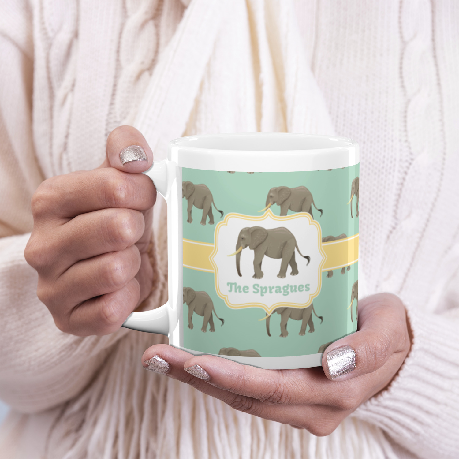 An elephant never forgets, and we hope you won't forget this Elephant design. The design shows gray, tusked elephants on a mint background with a light yellow ribbons. The center has a label with an elephant and a space for text.