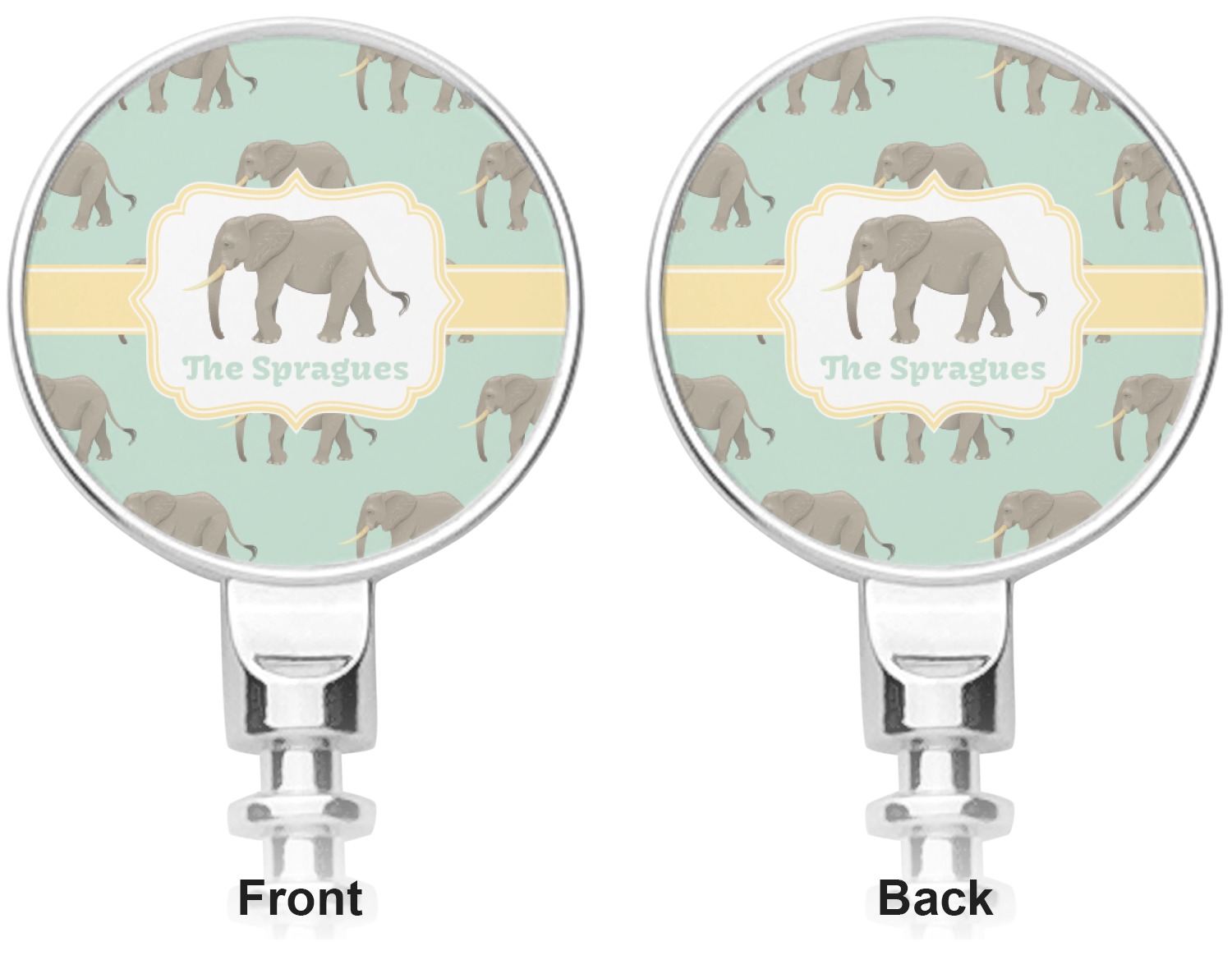 An elephant never forgets, and we hope you won't forget this Elephant design. The design shows gray, tusked elephants on a mint background with a light yellow ribbons. The center has a label with an elephant and a space for text.