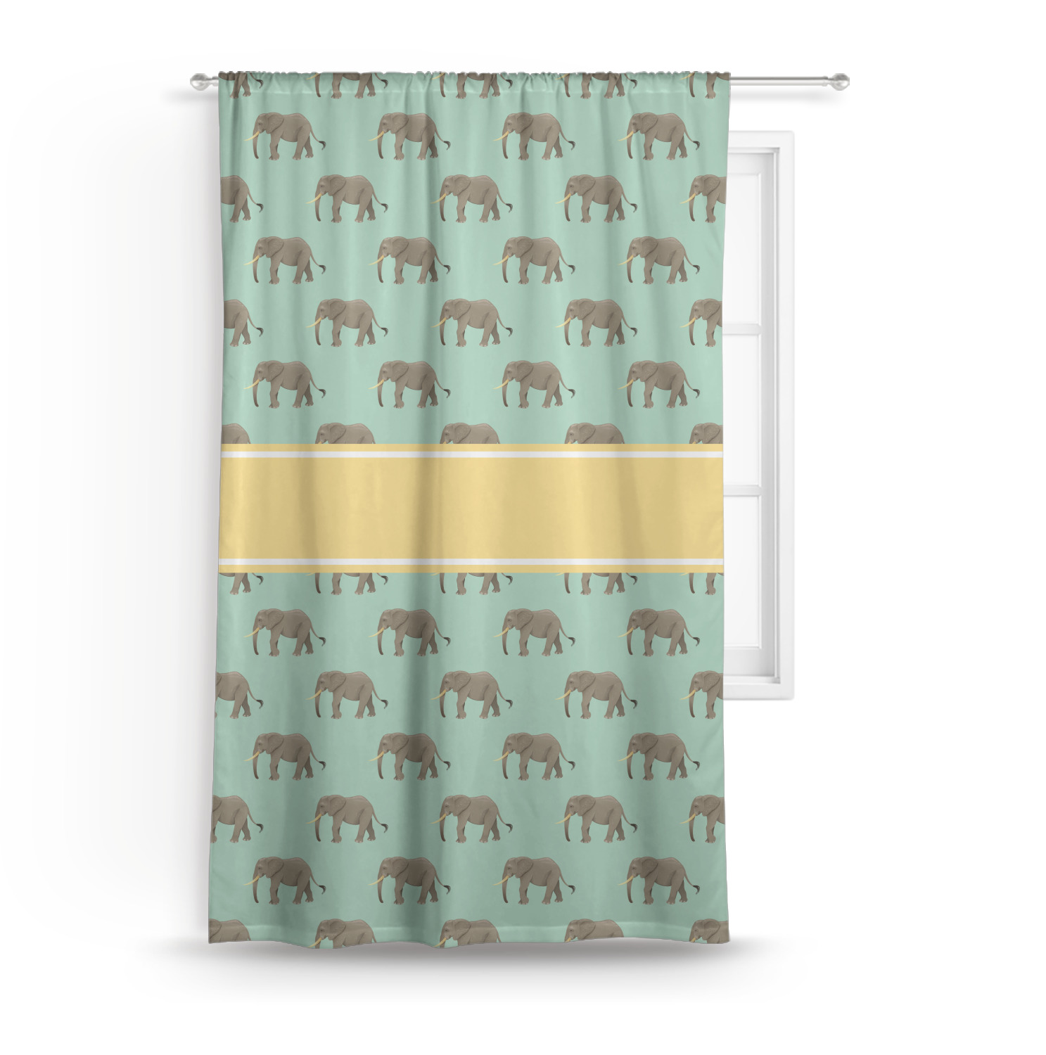 An elephant never forgets, and we hope you won't forget this Elephant design. The design shows gray, tusked elephants on a mint background with a light yellow ribbons. The center has a label with an elephant and a space for text.