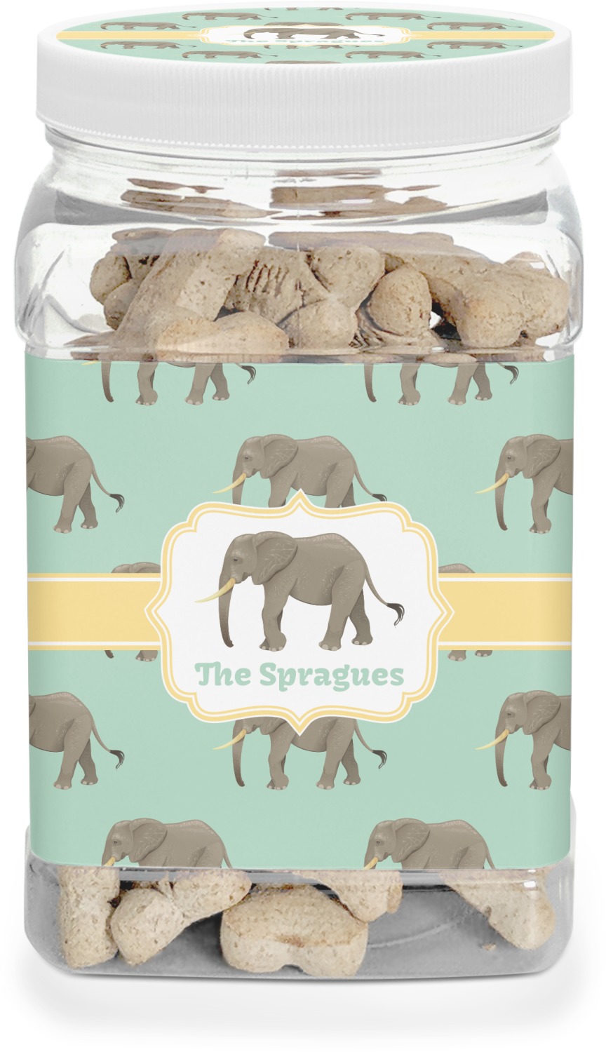 This half gallon jar, made from a sturdy plastic, is the perfect way to keep treats from any naughty pet paws, while still keeping them ready on hand for when your pup performs an impressive trick. This dog cookie jar features a screw-on, white lid that displays your personalized design on a vinyl sticker. We apply another customized sticker that wraps around the front and sides of the jar. Our dog treat jar also has indentations on the rear ends of the sides, which allows for convenient handling, and its square frame allows for easy storage.