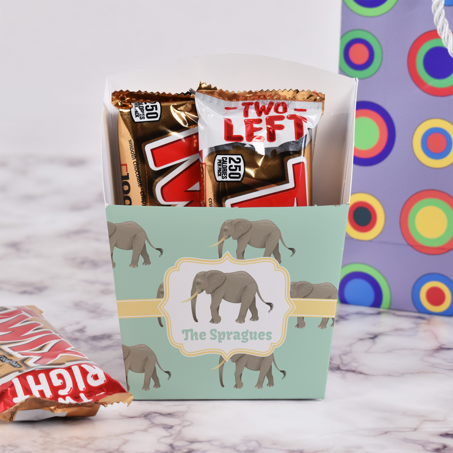 An elephant never forgets, and we hope you won't forget this Elephant design. The design shows gray, tusked elephants on a mint background with a light yellow ribbons. The center has a label with an elephant and a space for text.