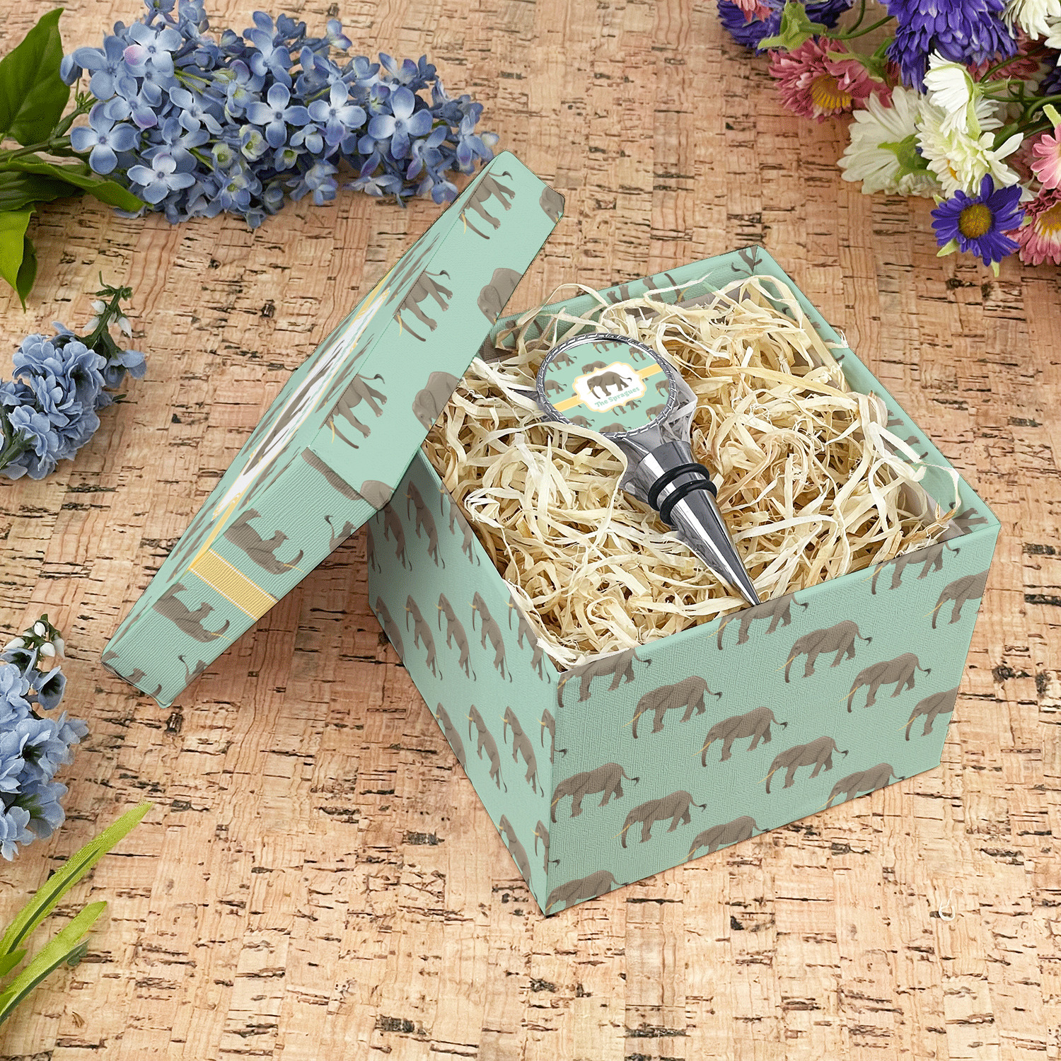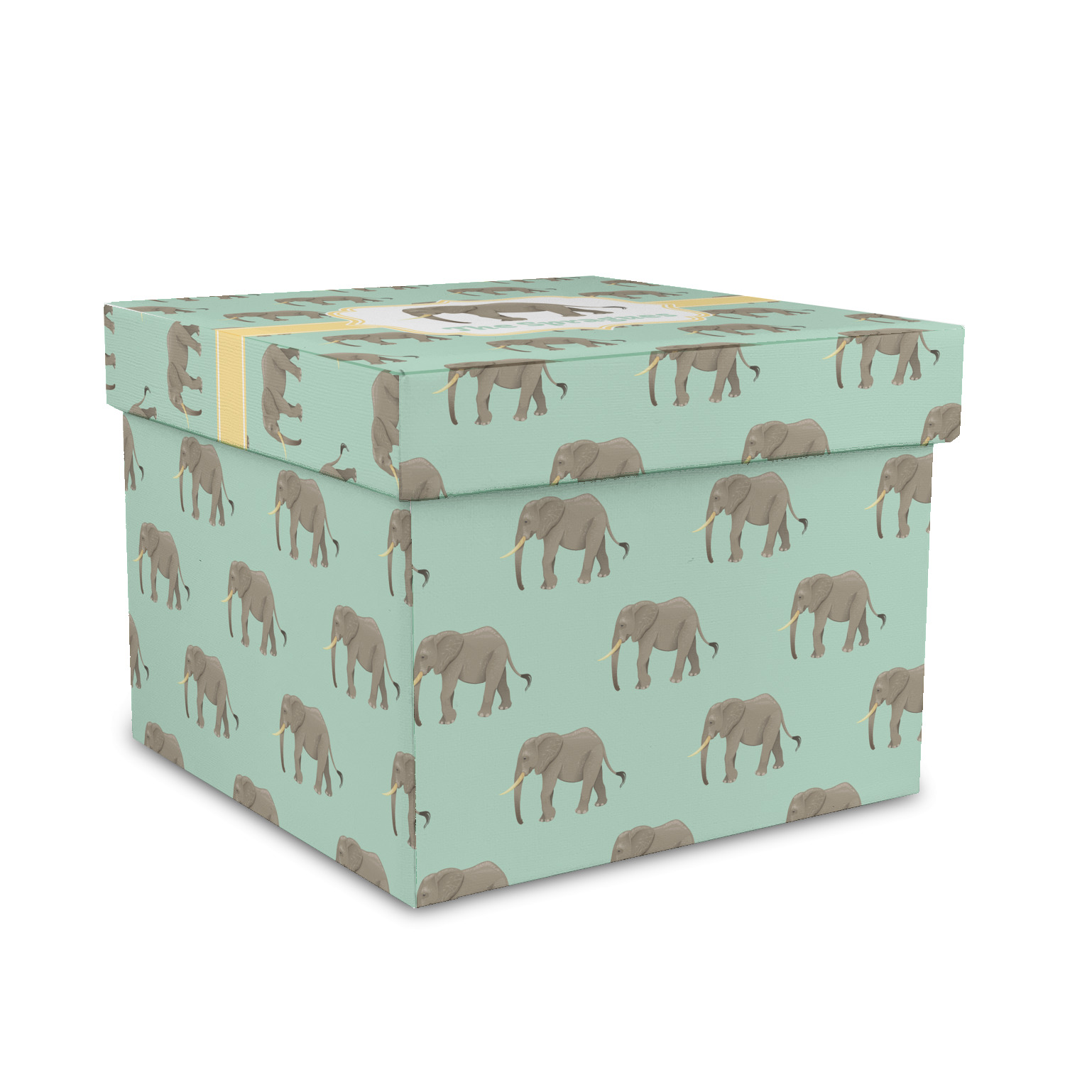 An elephant never forgets, and we hope you won't forget this Elephant design. The design shows gray, tusked elephants on a mint background with a light yellow ribbons. The center has a label with an elephant and a space for text.