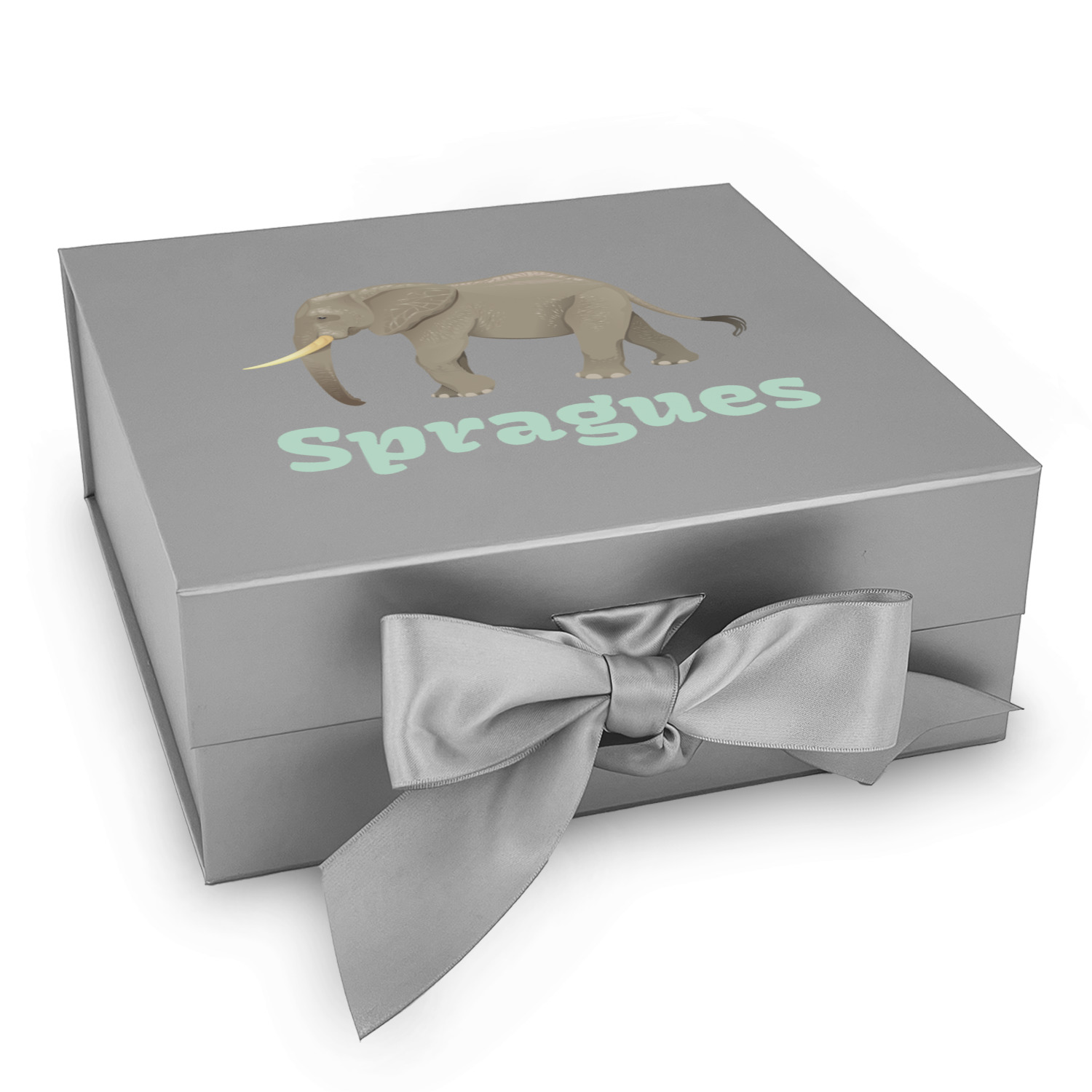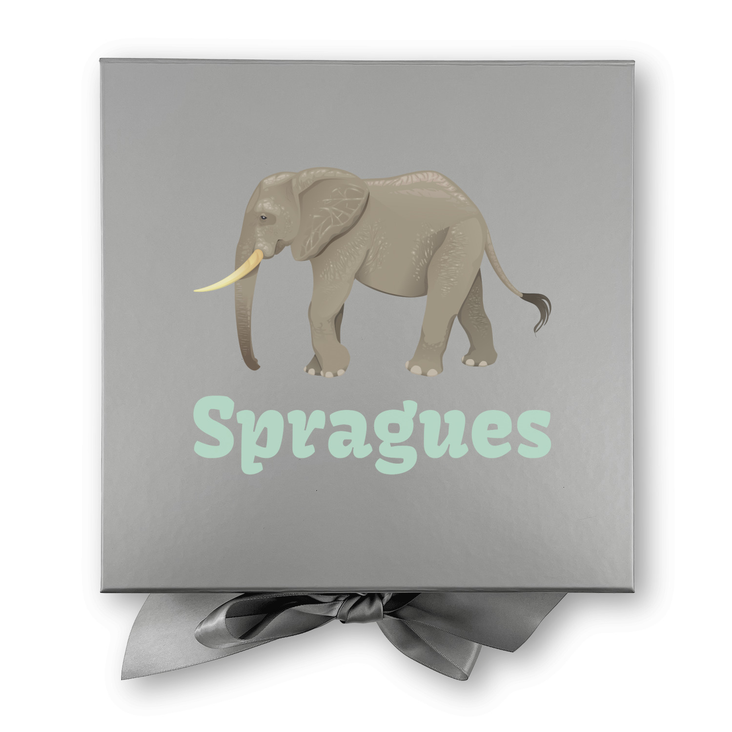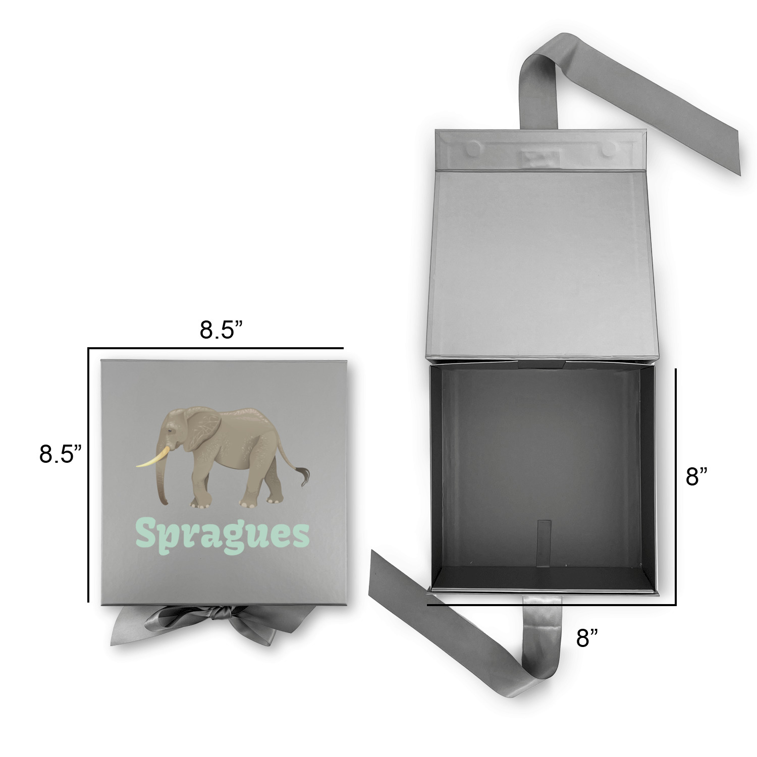 An elephant never forgets, and we hope you won't forget this Elephant design. The design shows gray, tusked elephants on a mint background with a light yellow ribbons. The center has a label with an elephant and a space for text.