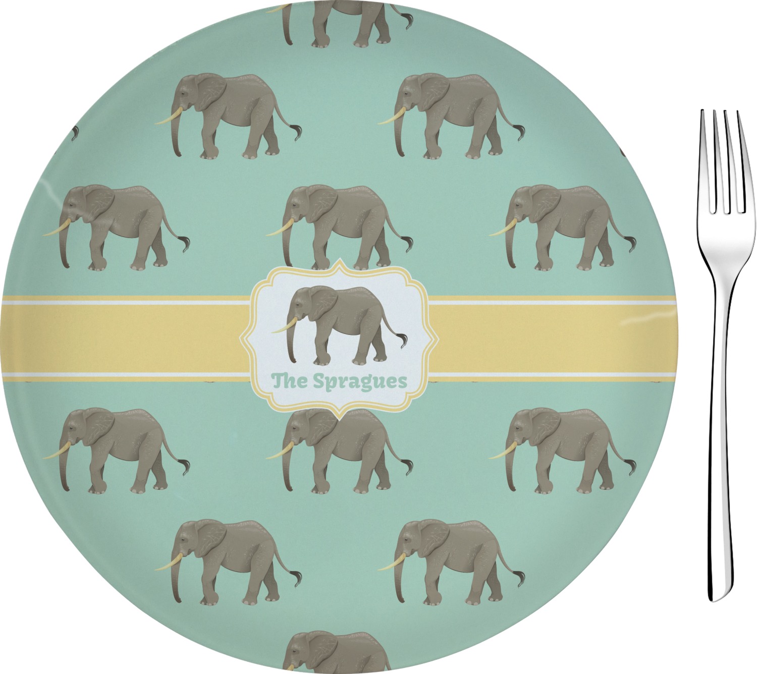 An elephant never forgets, and we hope you won't forget this Elephant design. The design shows gray, tusked elephants on a mint background with a light yellow ribbons. The center has a label with an elephant and a space for text.