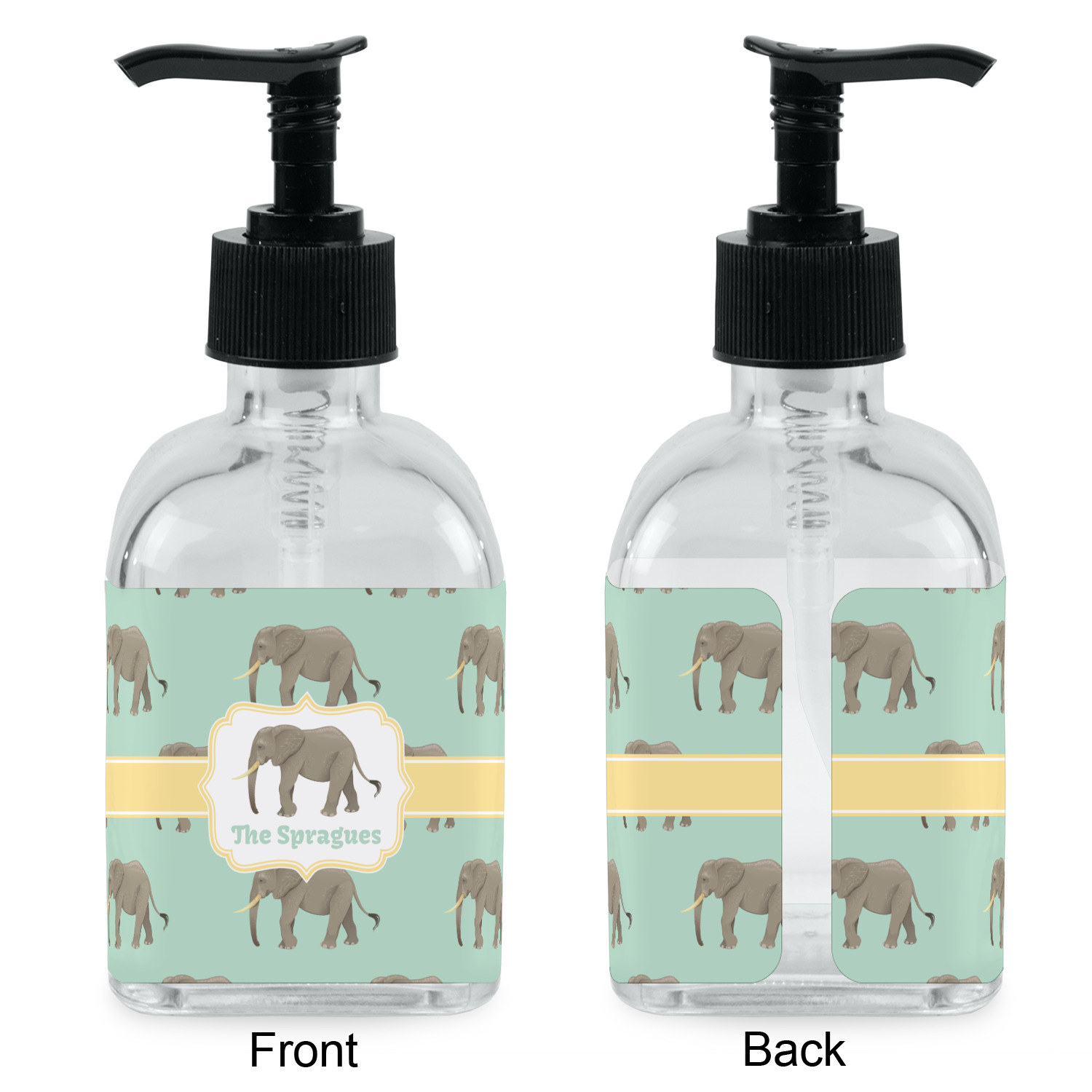 Crafted from a high-quality glass, these soap dispensers and lotion dispensers are durable and robust, while still looking elegant. They are sold with black pumps. Each soap dispenser pump measures at 6.5 by 2.25 inches. On these soap pumps, we display your customized design on a personalized vinyl adhesive on three sides. That way, you can judge how much liquid is in the bottles from the back.