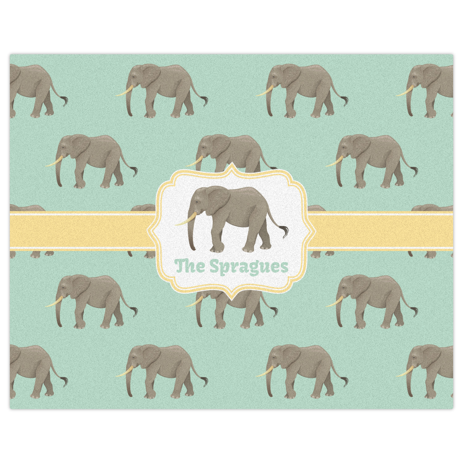 An elephant never forgets, and we hope you won't forget this Elephant design. The design shows gray, tusked elephants on a mint background with a light yellow ribbons. The center has a label with an elephant and a space for text.