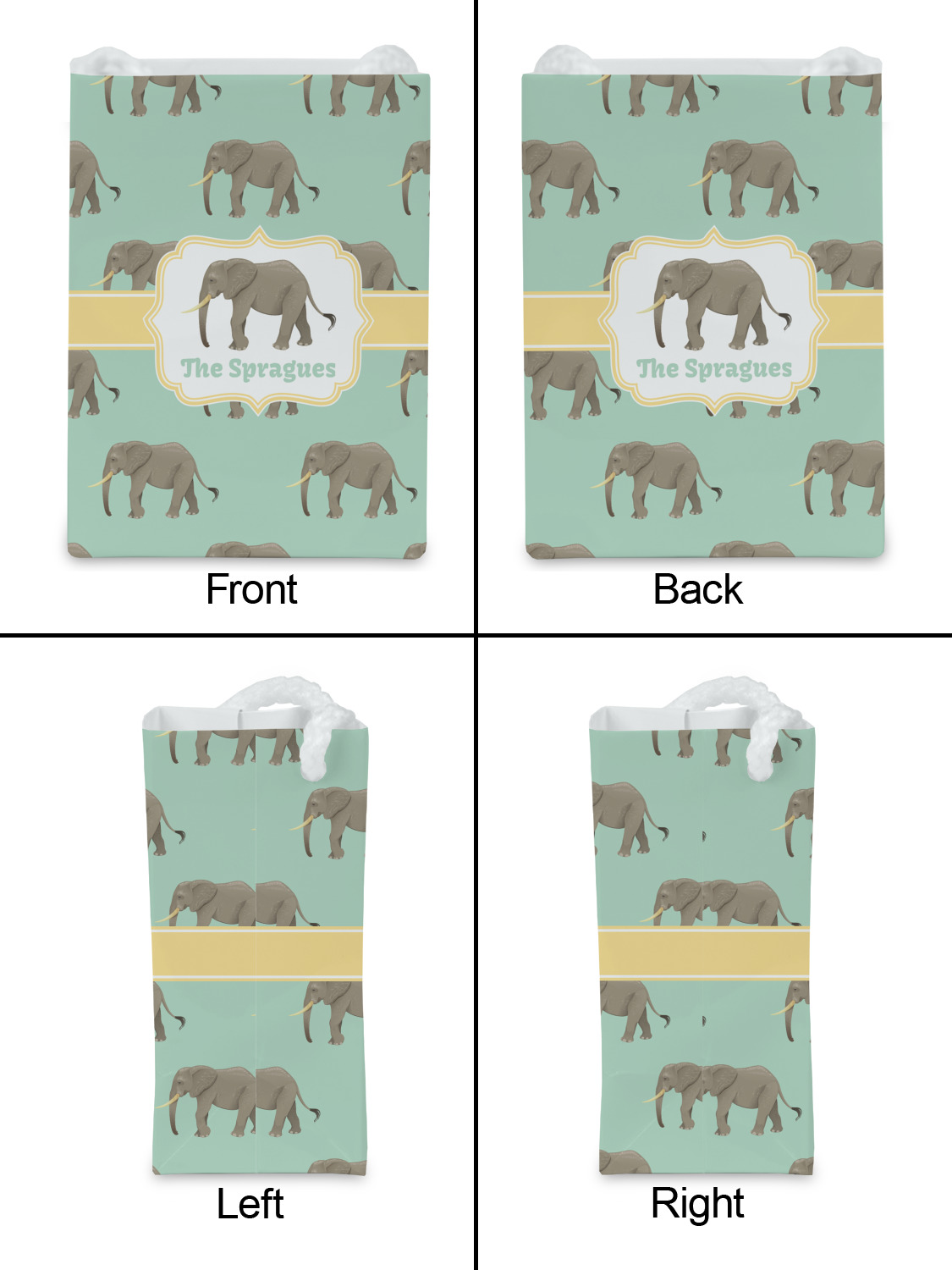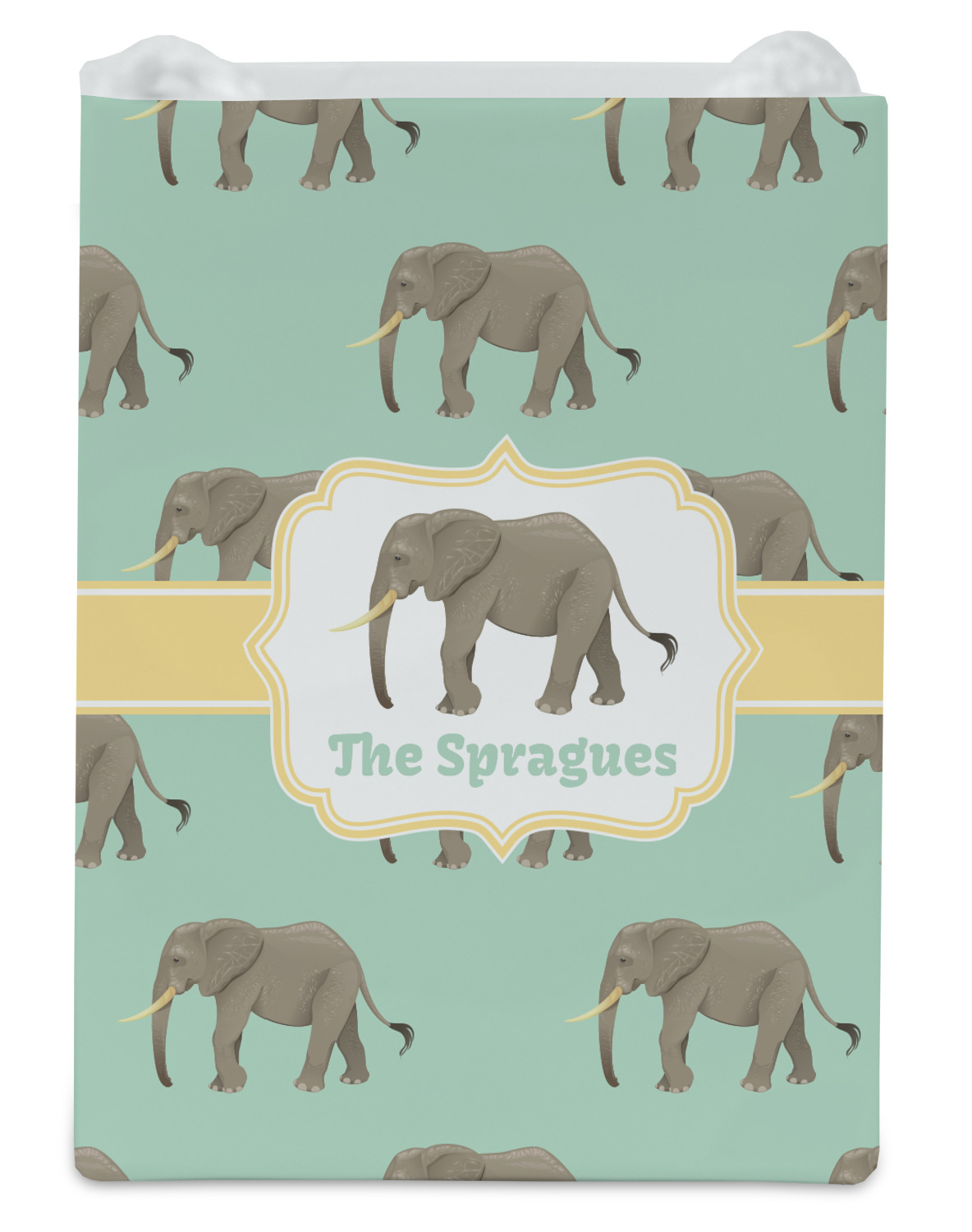 An elephant never forgets, and we hope you won't forget this Elephant design. The design shows gray, tusked elephants on a mint background with a light yellow ribbons. The center has a label with an elephant and a space for text.