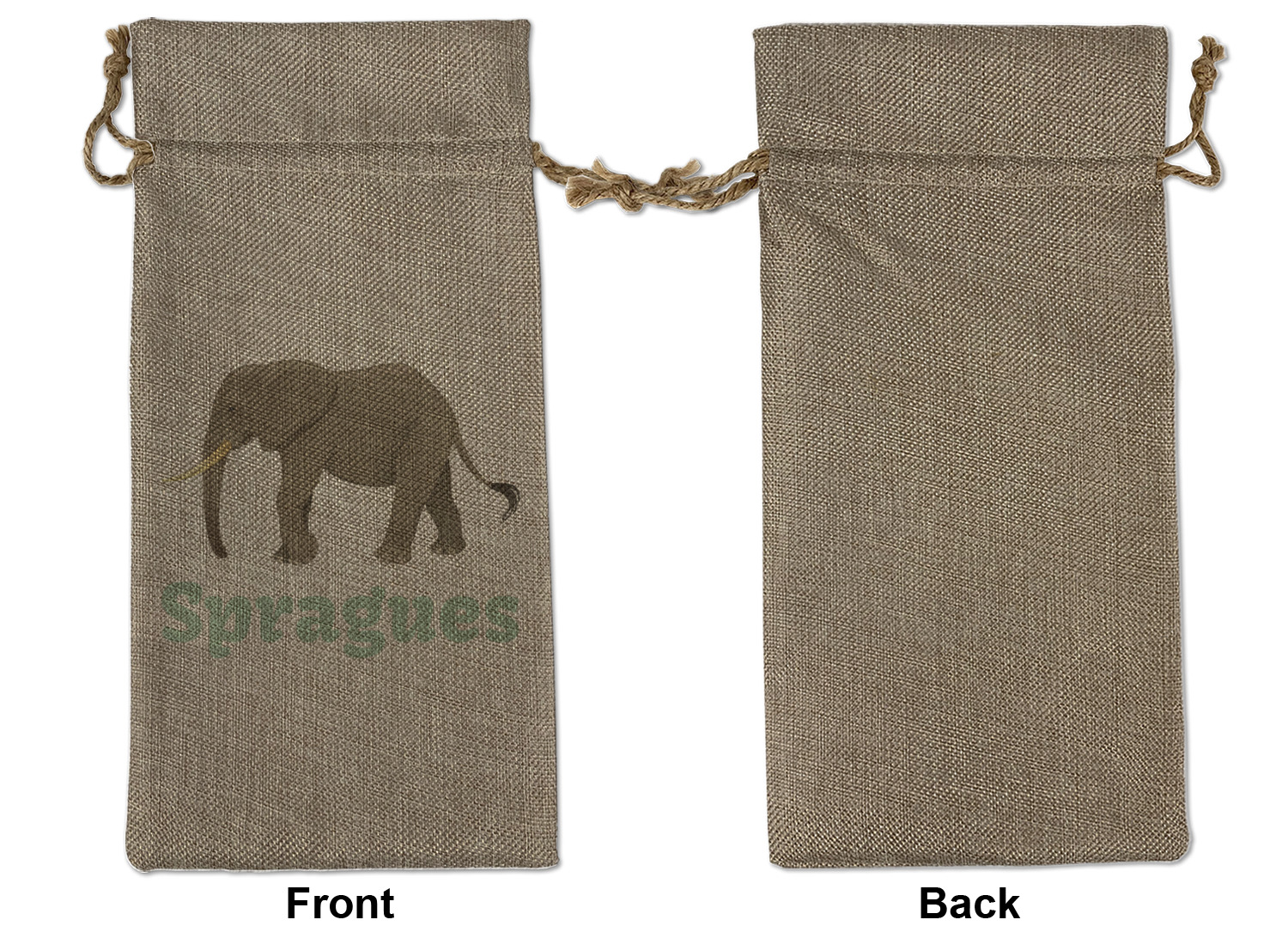 We sell our Burlap Gift Bags in 3 variant sized bags. Made with burlap polyester, each personalized bag can be secured with a twine drawstring pull. Your custom design is available to print on one side or both sides - completely up to you! The sizes of the bags measure approximately 4.5" x 6.5" for the smallest size, 6.5" x 8.0" for the medium size, and 6.5" x 13.5" for the large-sized bag.
