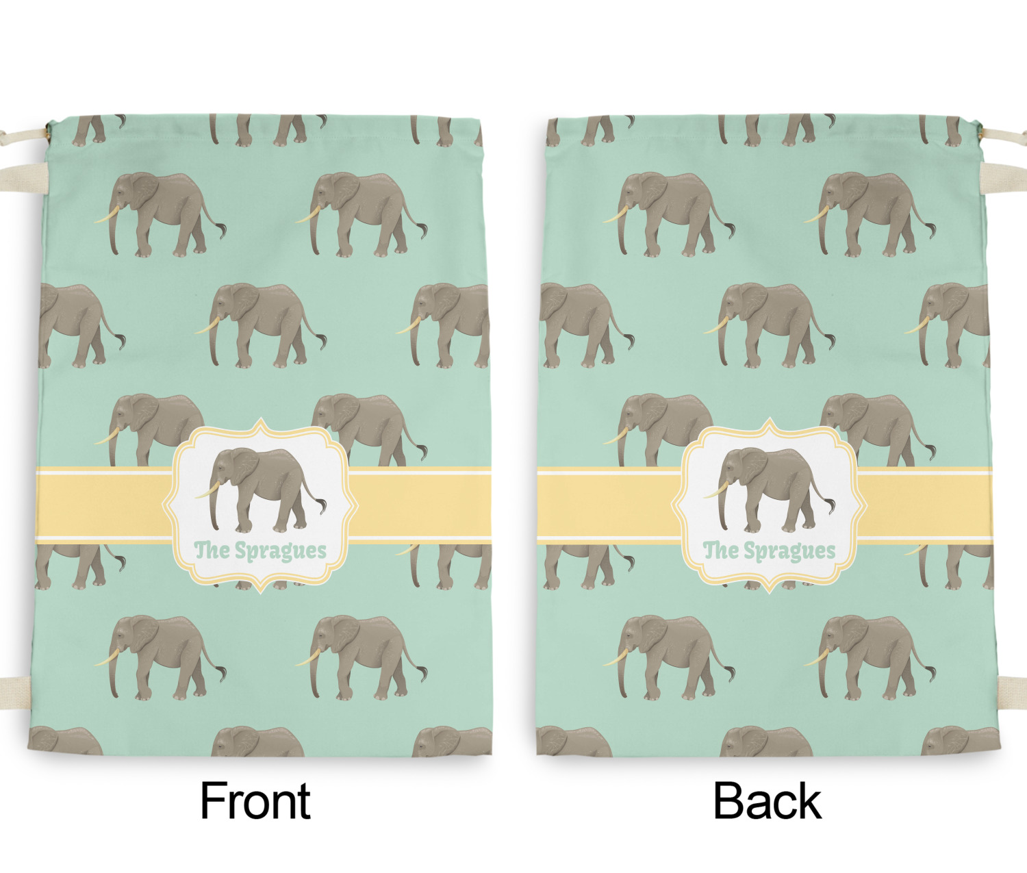An elephant never forgets, and we hope you won't forget this Elephant design. The design shows gray, tusked elephants on a mint background with a light yellow ribbons. The center has a label with an elephant and a space for text.