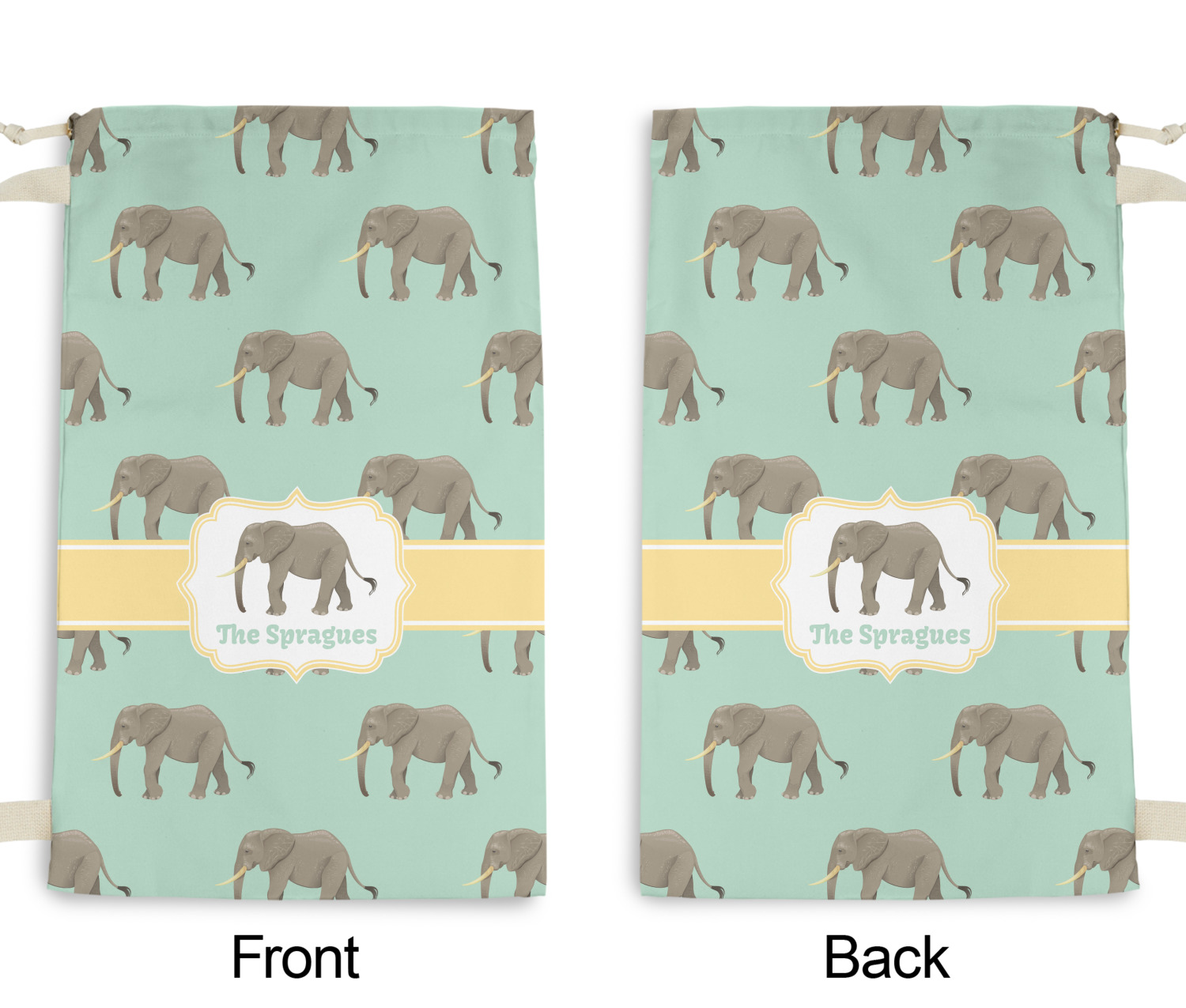 An elephant never forgets, and we hope you won't forget this Elephant design. The design shows gray, tusked elephants on a mint background with a light yellow ribbons. The center has a label with an elephant and a space for text.