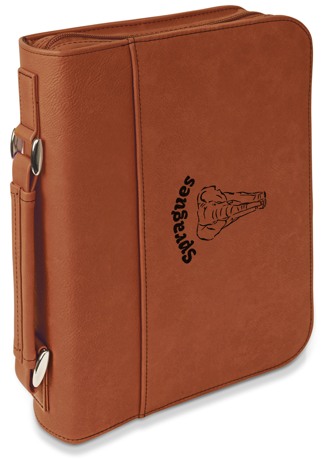 These book covers are fabricated from a fine leatherette in a warm, cognac shade of brown. A wide pocket spans across the front of the book jacket [2,400] and can store any loose papers or notes that you wish to keep. The interior of this personalized Bible cover includes slots on both sides to house the covers of your Bible, and keep it in place. The inside of the spine has a small elastic band to secure a pen. A zipper lines three sides of the cover, while the fourth side features a reinforced handle that allows for easy transport of your enclosed book.