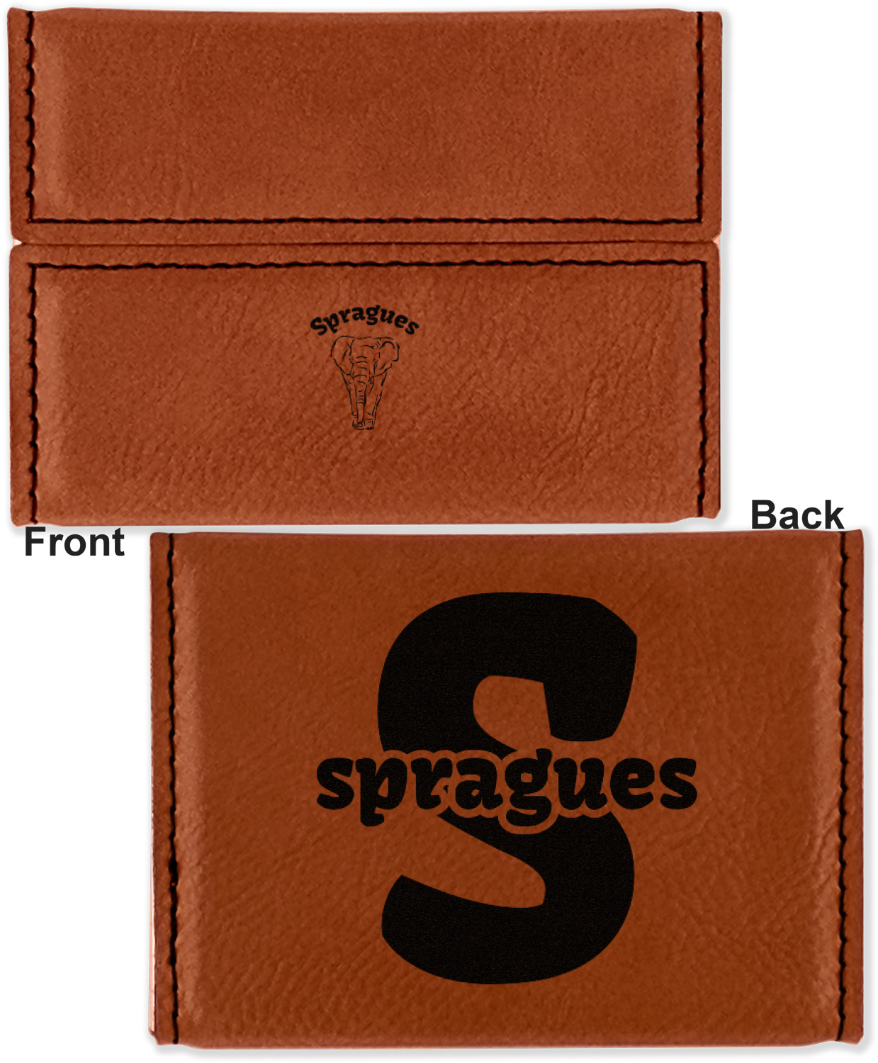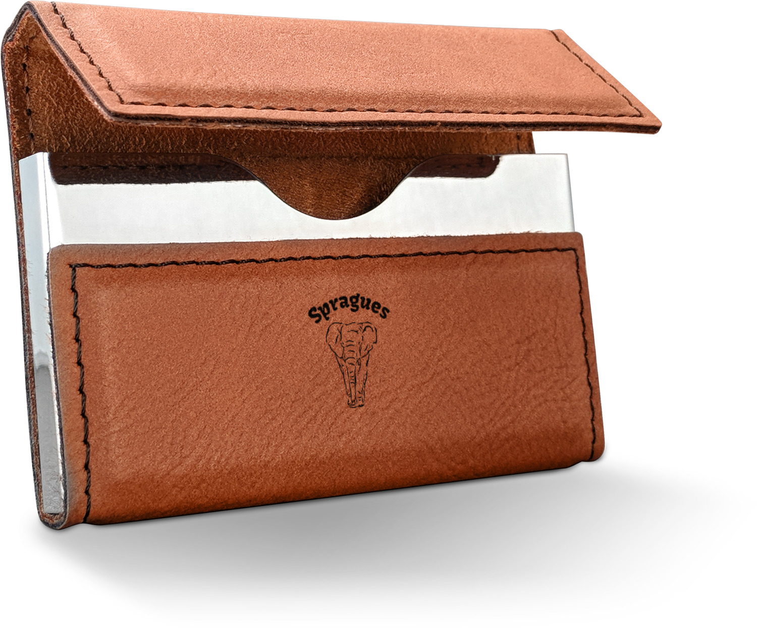Your personalized design is laser engraved onto either the front, or the front and back of the card holder, depending on the model you purchase. Once engraved, the design will appear a darkened black against the cognac color of the leatherette.