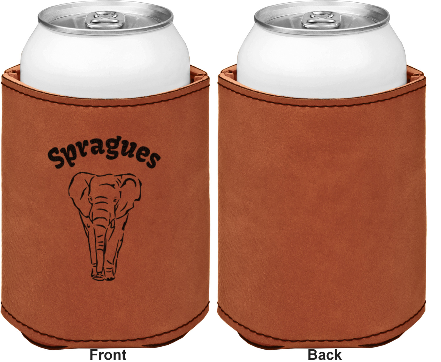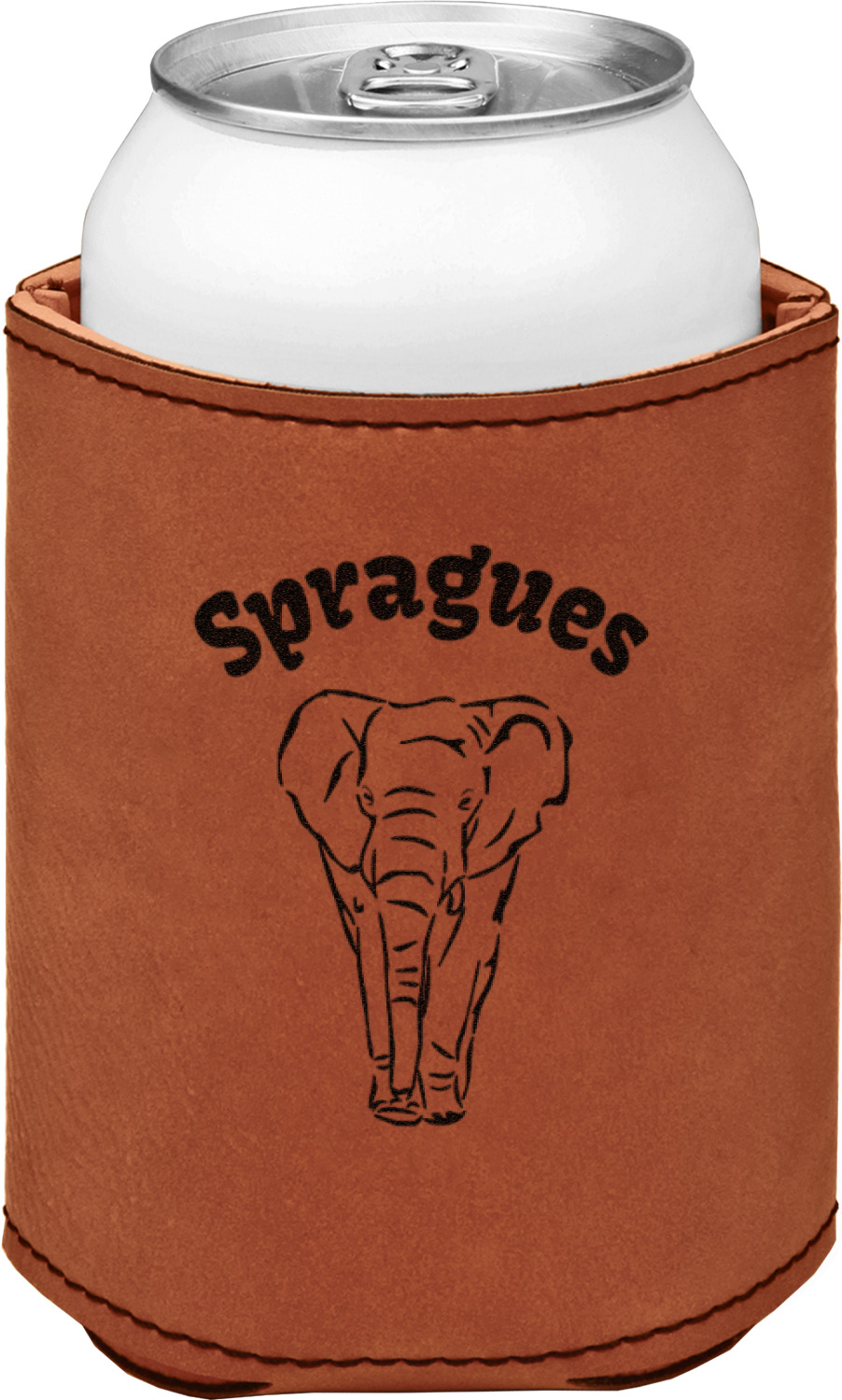 This can sleeve is made from a cognac-brown leatherette and stitched with a sturdy, black thread. A slim padding lines the inside of your can sleeve to allow for a better fit once your drink is inserted. The sleeve itself measures at 4 by 4.5 inches, allowing this custom can sleeve to accommodate most canned drinks. Your personalized design can be engraved on the front and back, or solely the front. When laser-engraved, your design appears as a black coloration which contrasts the leatherette nicely.