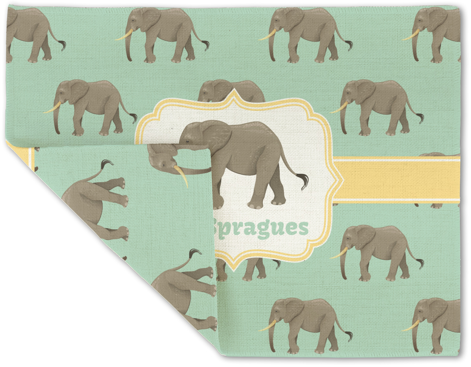 An elephant never forgets, and we hope you won't forget this Elephant design. The design shows gray, tusked elephants on a mint background with a light yellow ribbons. The center has a label with an elephant and a space for text.