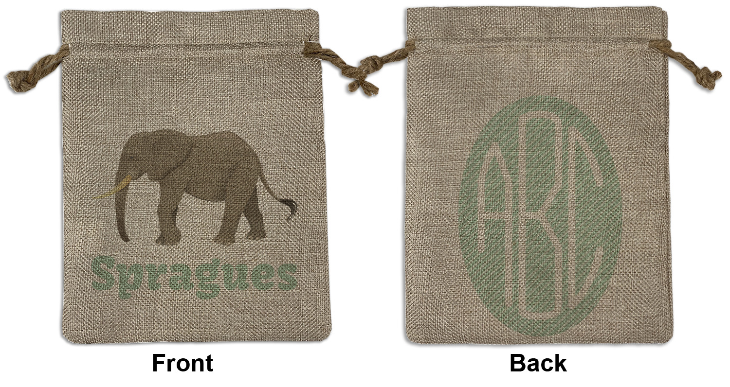 We sell our Burlap Gift Bags in 3 variant sized bags. Made with burlap polyester, each personalized bag can be secured with a twine drawstring pull. Your custom design is available to print on one side or both sides - completely up to you! The sizes of the bags measure approximately 4.5" x 6.5" for the smallest size, 6.5" x 8.0" for the medium size, and 6.5" x 13.5" for the large-sized bag.