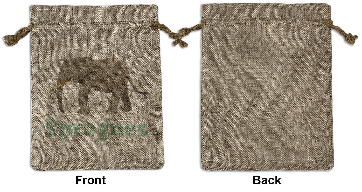We sell our Burlap Gift Bags in 3 variant sized bags. Made with burlap polyester, each personalized bag can be secured with a twine drawstring pull. Your custom design is available to print on one side or both sides - completely up to you! The sizes of the bags measure approximately 4.5" x 6.5" for the smallest size, 6.5" x 8.0" for the medium size, and 6.5" x 13.5" for the large-sized bag.