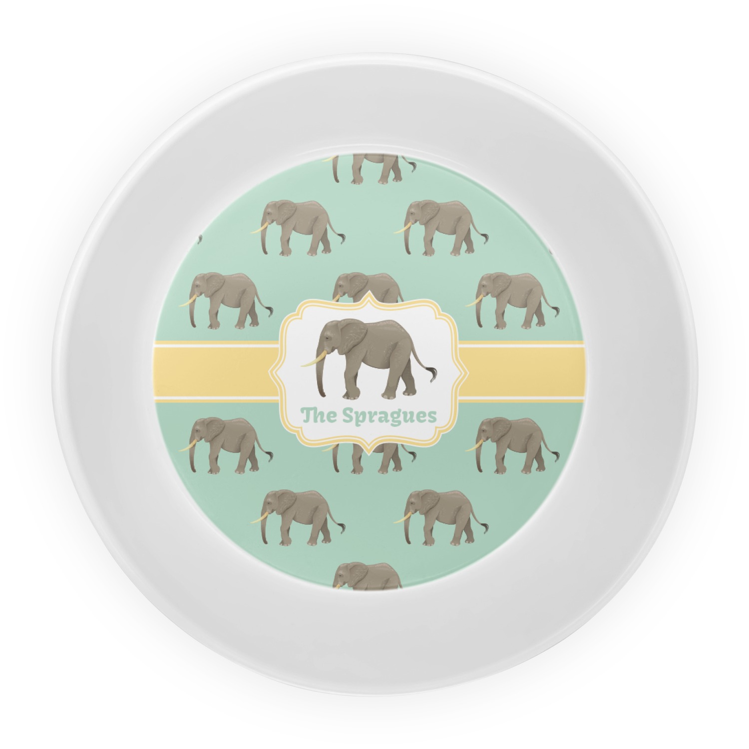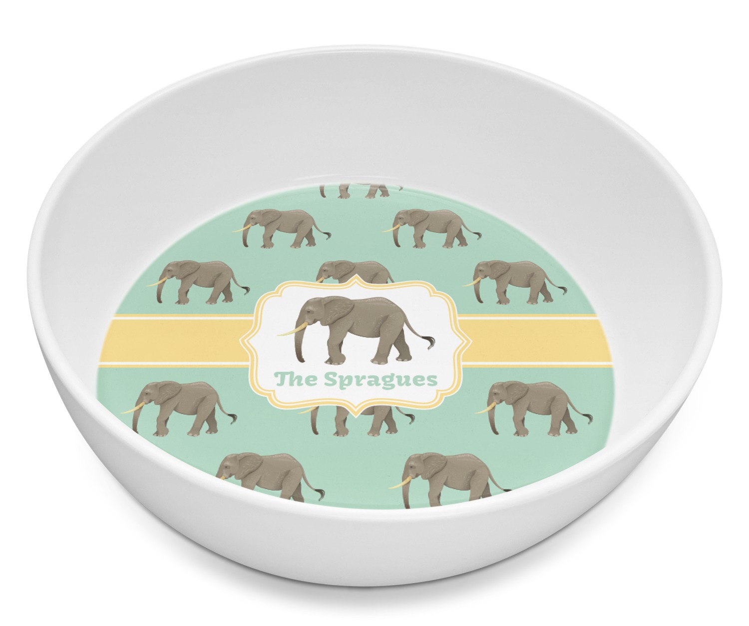 An elephant never forgets, and we hope you won't forget this Elephant design. The design shows gray, tusked elephants on a mint background with a light yellow ribbons. The center has a label with an elephant and a space for text.