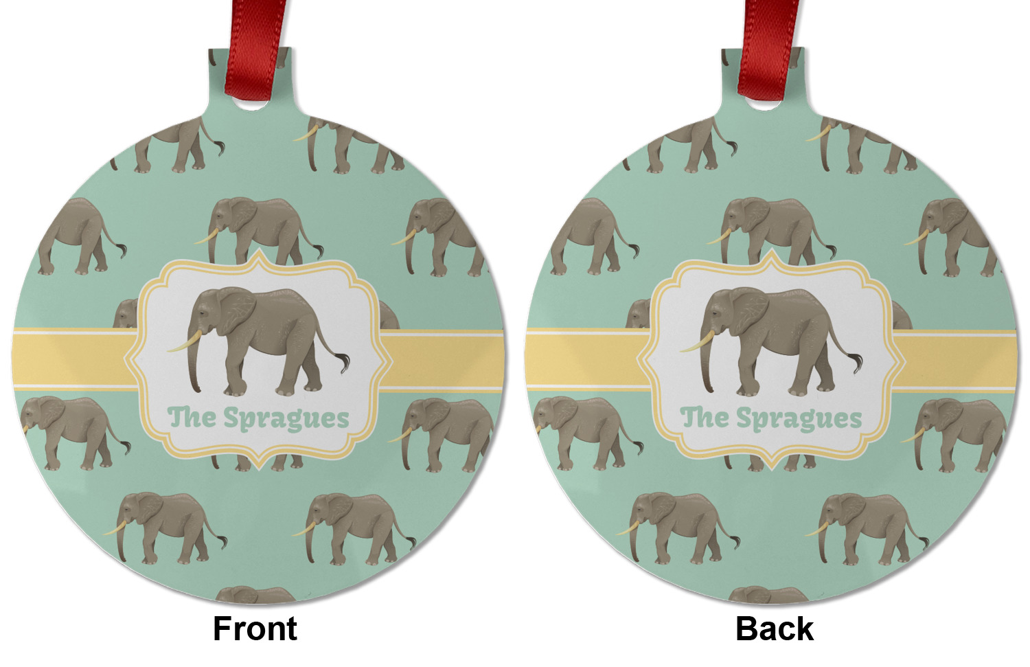 An elephant never forgets, and we hope you won't forget this Elephant design. The design shows gray, tusked elephants on a mint background with a light yellow ribbons. The center has a label with an elephant and a space for text.