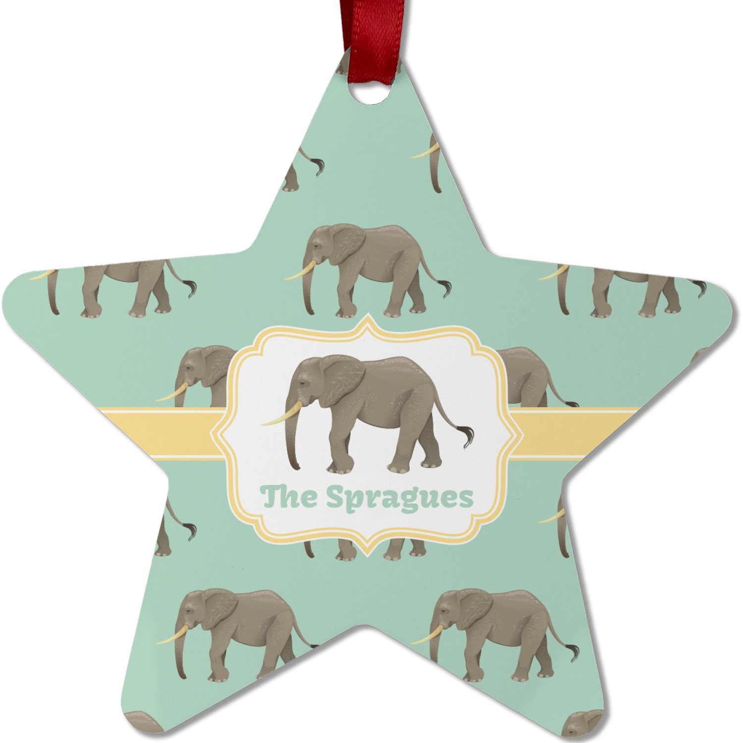 An elephant never forgets, and we hope you won't forget this Elephant design. The design shows gray, tusked elephants on a mint background with a light yellow ribbons. The center has a label with an elephant and a space for text.