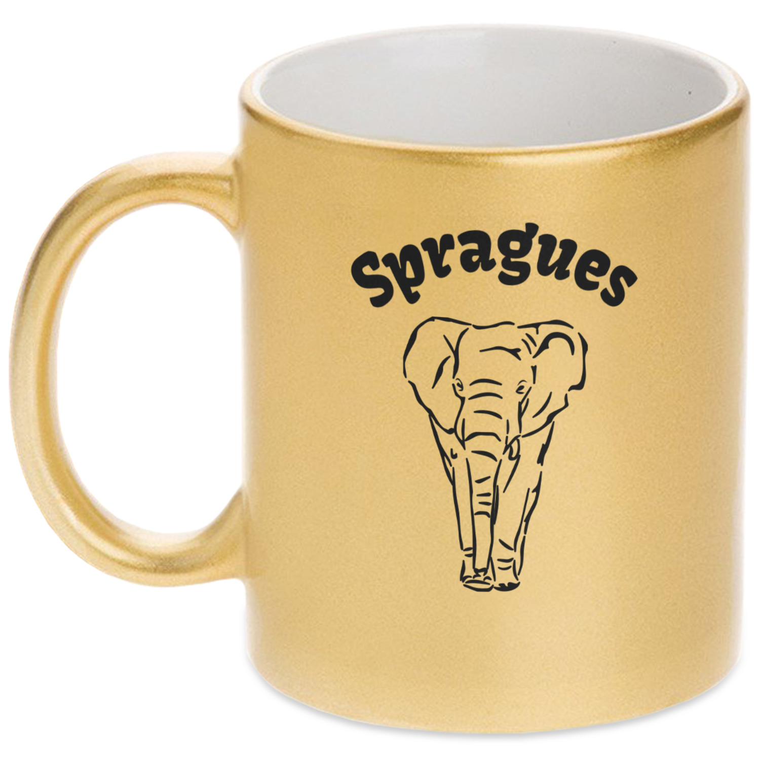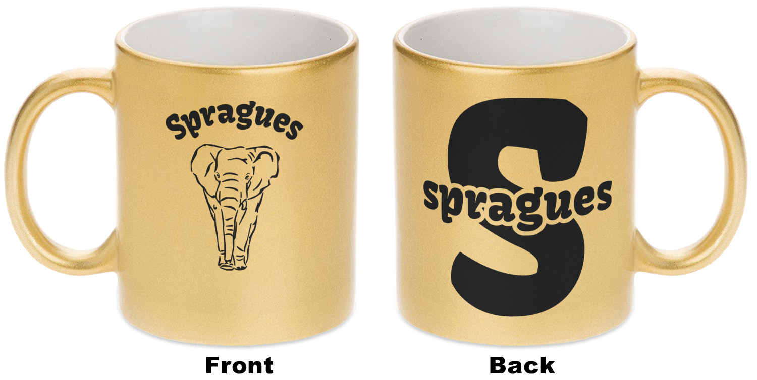 Our custom mugs are ceramic, which is great for keeping your tea or coffee warm! We offer two metallic mugs to personalize - Silver or Gold. Both styles hold around 11oz and have dimensions of approximately 3.75" x 3.5" x 4.75". Both the metallic mugs come in a matte finish and have glitter detailing to add a more pristine feel to the gold and silver base colors.