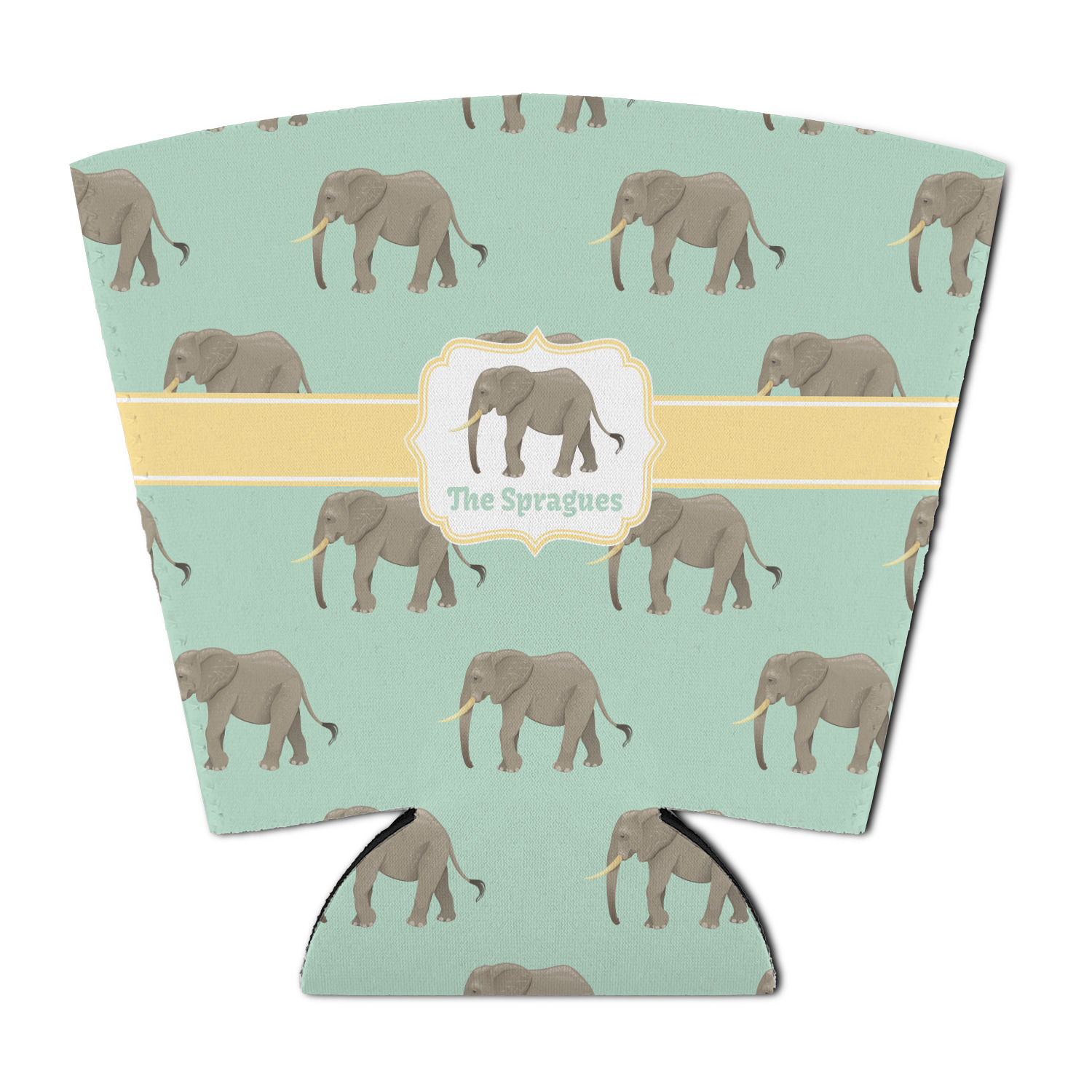 An elephant never forgets, and we hope you won't forget this Elephant design. The design shows gray, tusked elephants on a mint background with a light yellow ribbons. The center has a label with an elephant and a space for text.